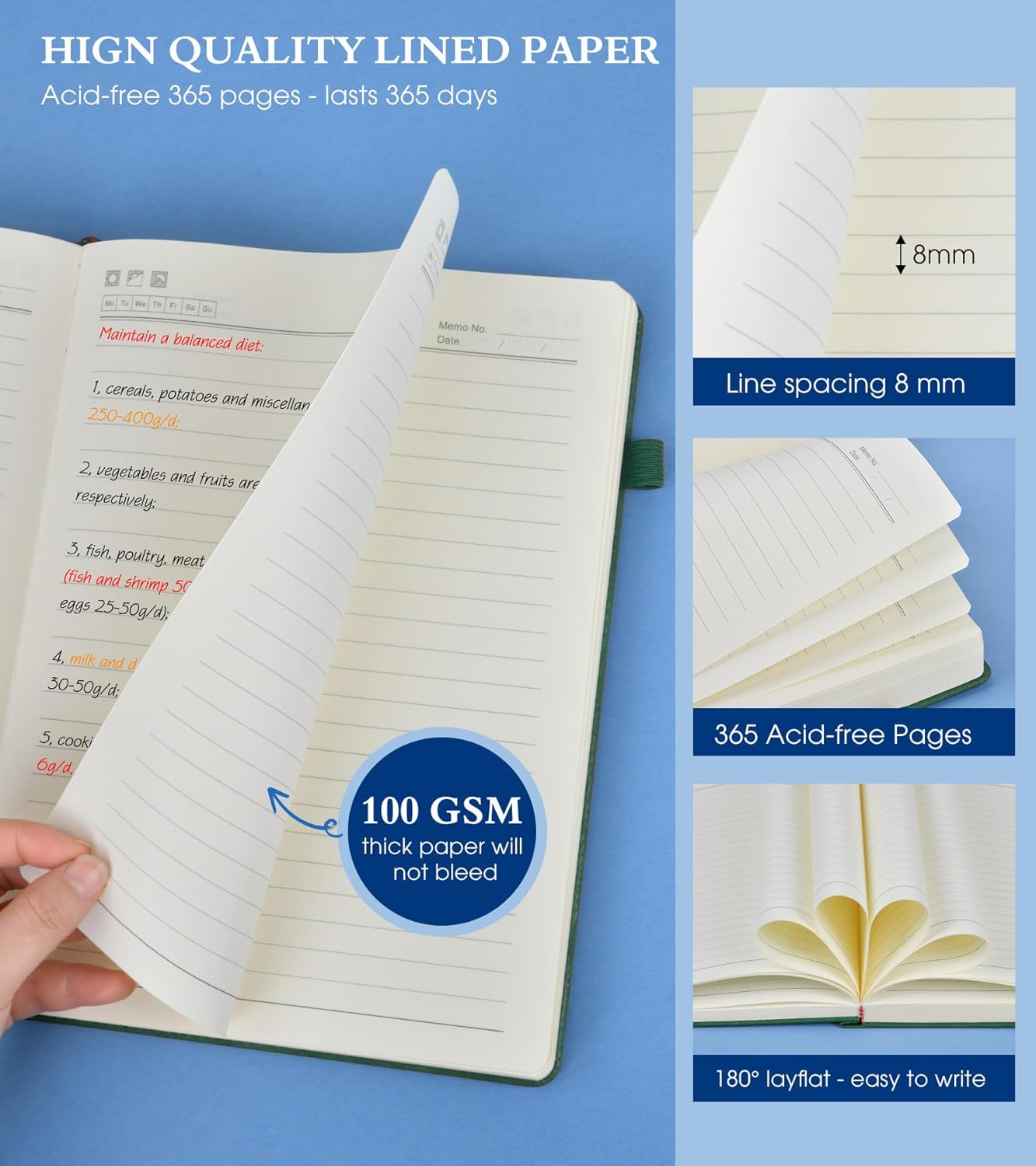 - 【365 Pages Premium Thick Lined Paper】: Our PERCUN lined journal notebook is made of 365 pages high-quality 100Gsm thick ruled pager with an acid-free light Ivory paper that is thicker than normal. This premium quality paper will not cause bleeding, ghosting or smudging and is suitable for most types of pens,provides ample space for journaling, note-taking, and creative writing. The line spacing is 7mm, making it easy to write legibly and neatly.