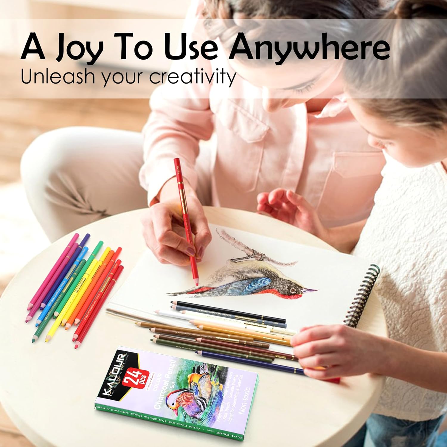 KALOUR PDAS 24 Premium Colored Charcoal Pencils Drawing Set, Quality Pastel Chalk Pencils, Skin Tone Colored, for Coloring, Sketching, Drawing, Layering & Blending for Beginners & Artists