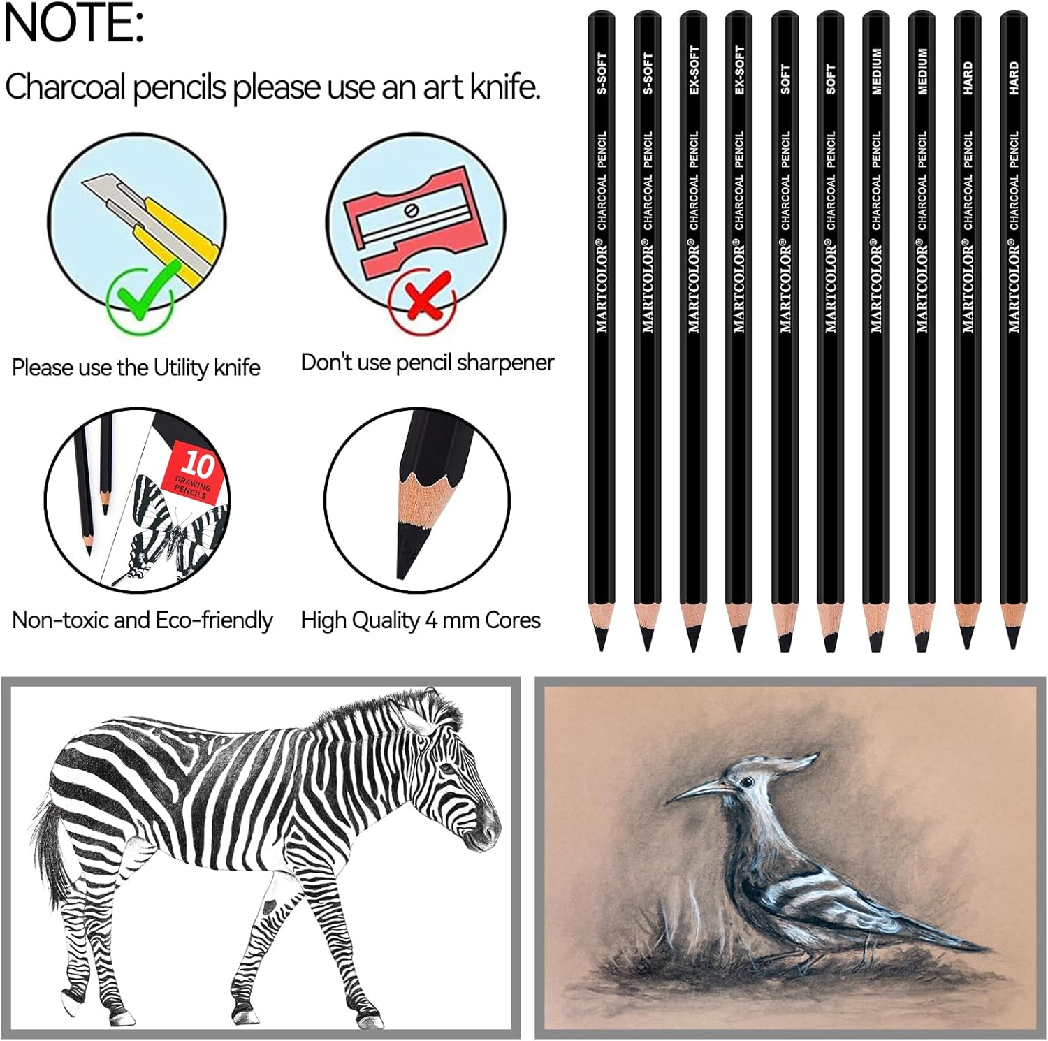 - PERFECT CHARCOAL DRAWING SET - Charcoal Drawing Kit including 10 pcs charcoal pencils, available in five different grades (2 pcs Super Soft, 2 pcs Ex-Soft, 2 pcs Soft, 2 pcs Medium, 2 pcs Hard). Great for sketching, drawing, shading and blending.