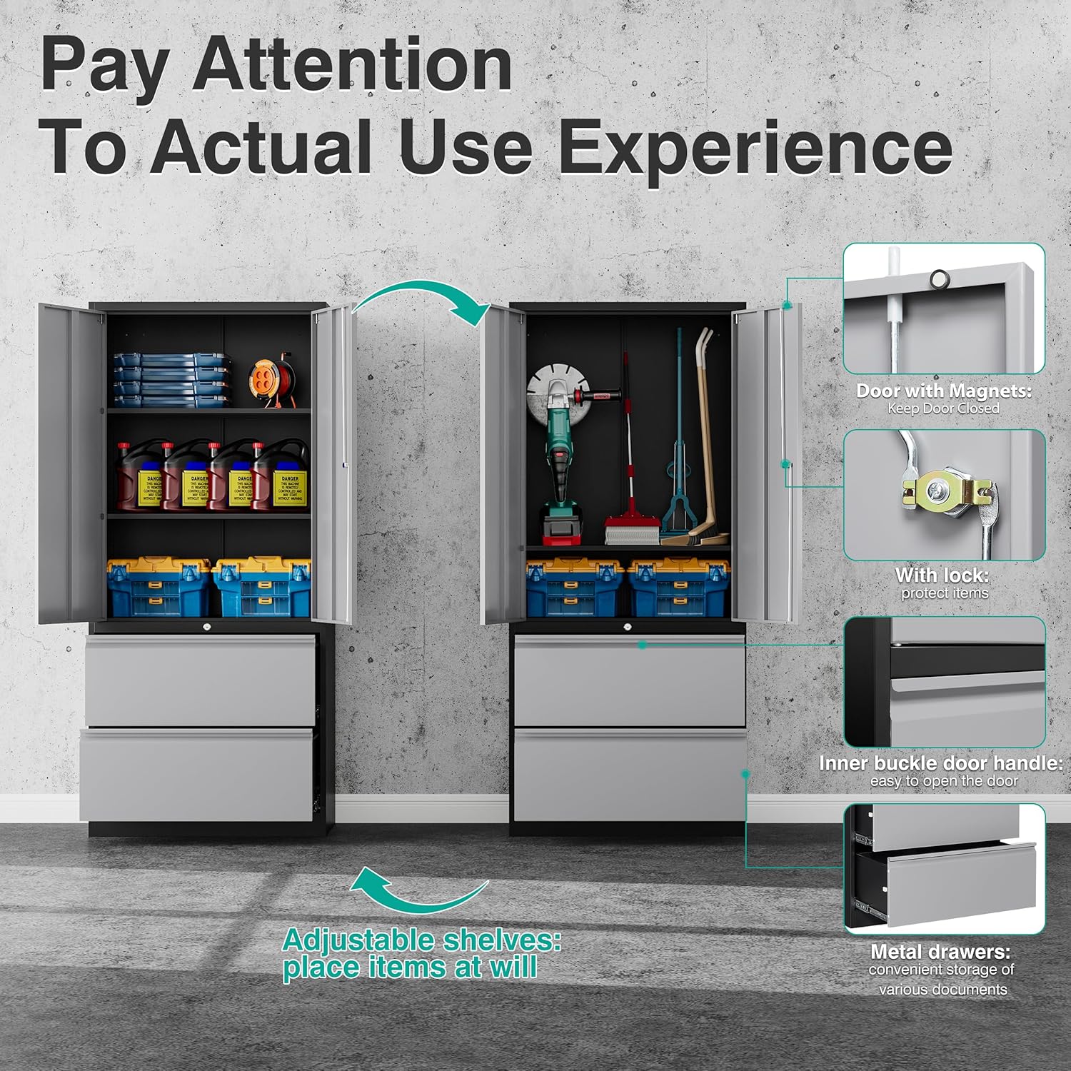 - 【Large Capacity】: High steel storage cabinet with 2 adjustable shelf to meet your different needs for placing items, shelf and door lock can highly protect items from temperature, dirt and dust