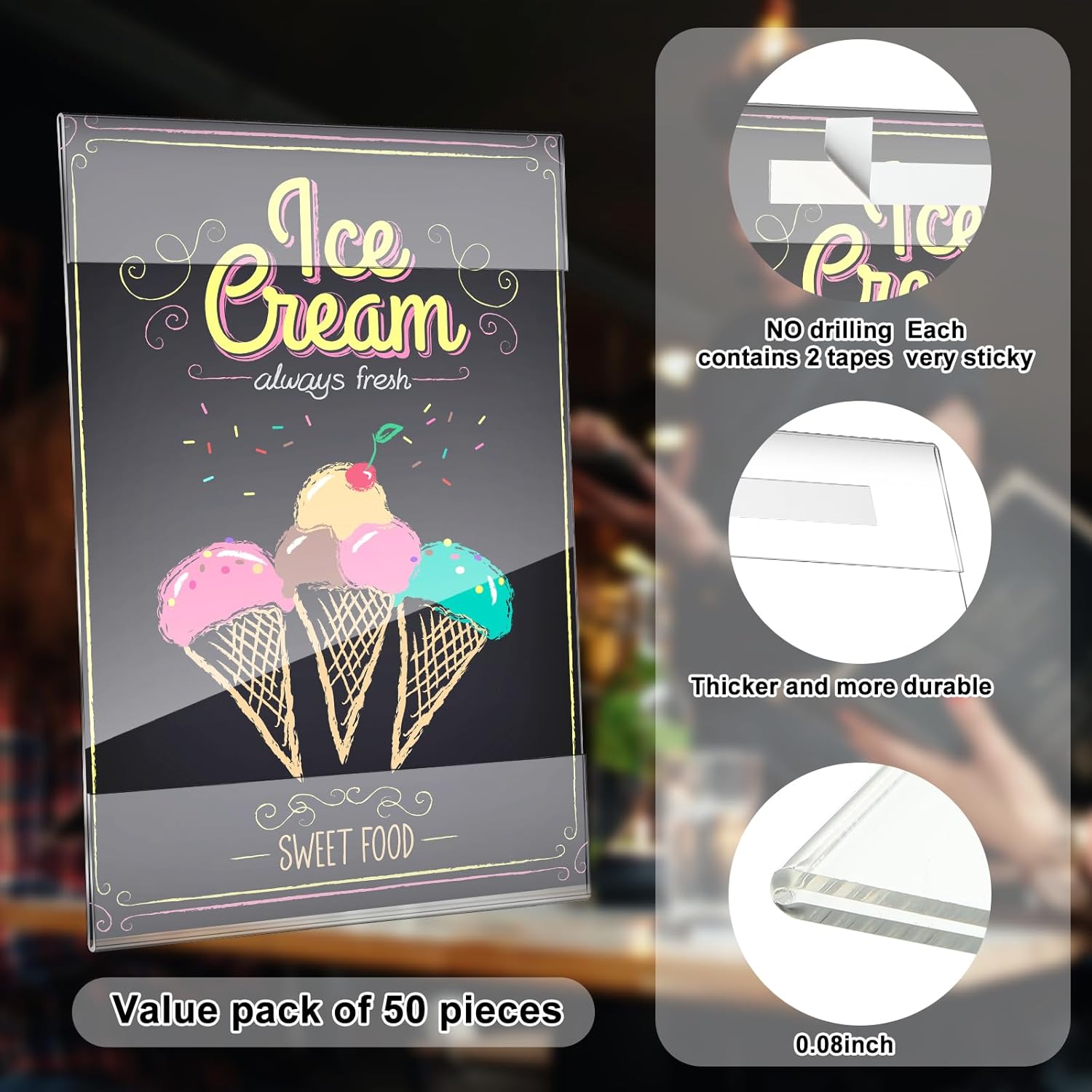 Kigley 50 Packs 8.5 x 11 Wall Mount Acrylic Sign Holder Clear Acrylic Sign Holder with Tape Wall Mount Plastic Paper Display Frame Document Menu Holder for Office Home Store Restaurant No Drilling