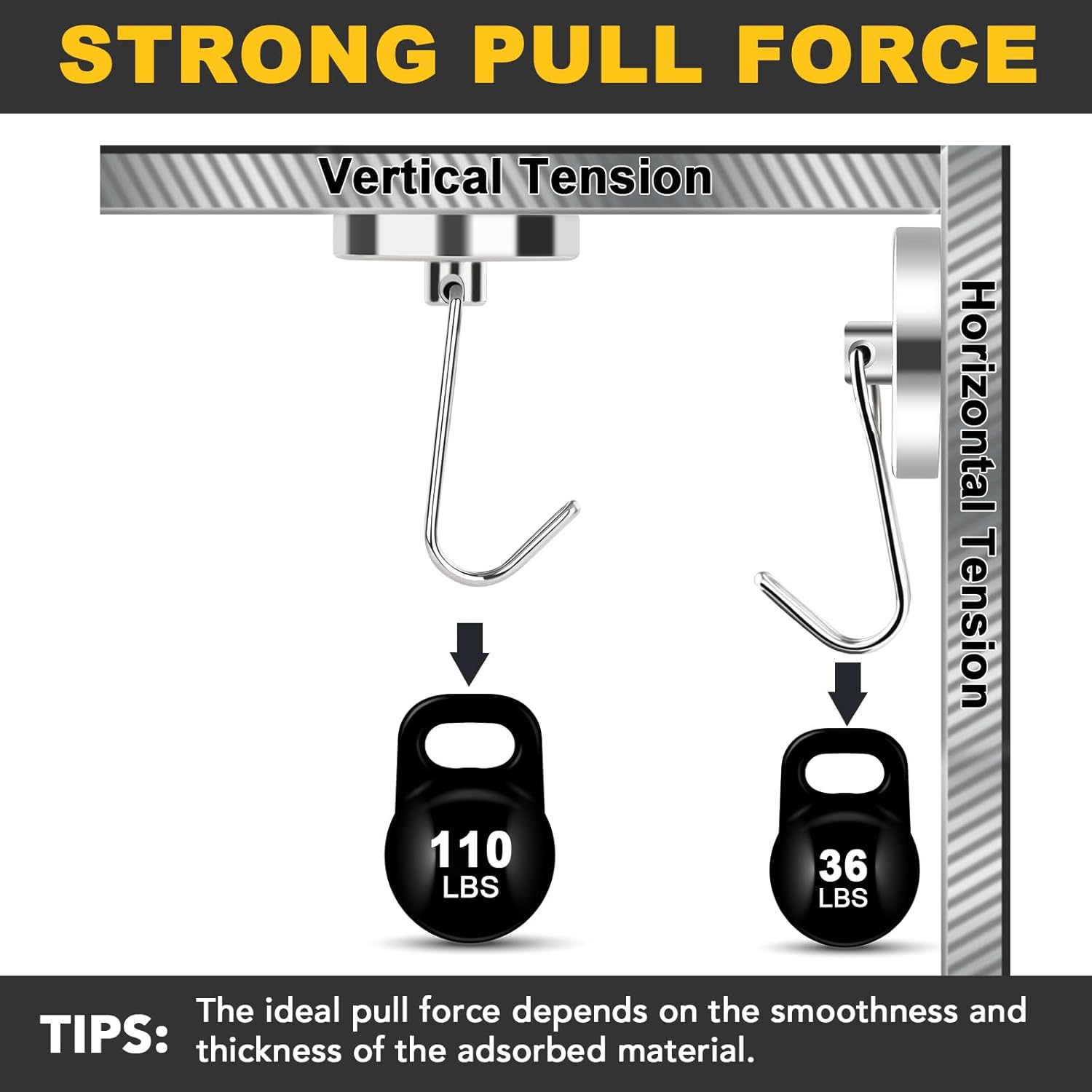 - STRONG HANGING CAPACITY: Heavy duty magnetic hooks are made of neodymium magnets offer more than 110lbs pull force on horizon, reduce to nearly 37lbs if used vertically. Our magnetic metal hooks will securely attach to any metallic surface