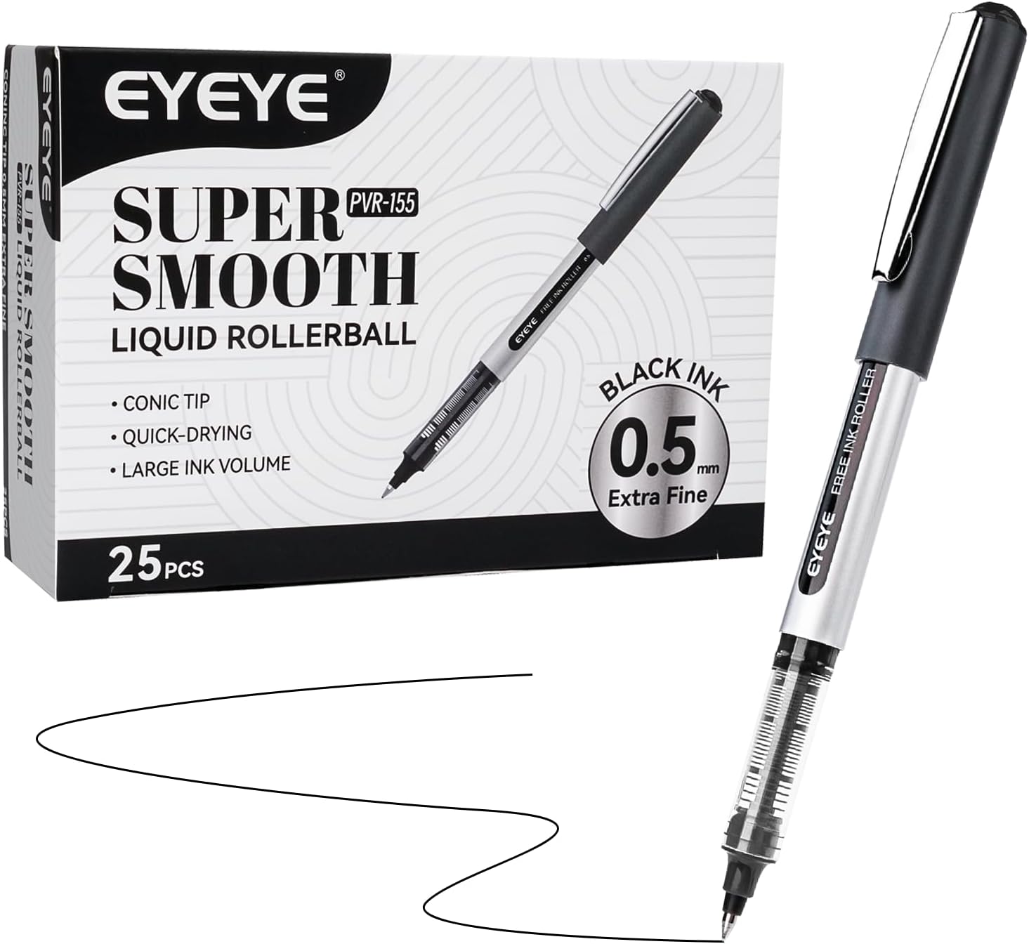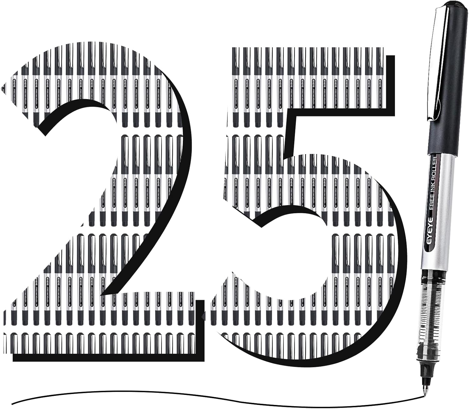 EYEYE 0.5mm Black Rollerball Pens 25 Pack, Extra Fine Point Roller Ball Pen Quick Dry, Liquid Ink Pens Fine Point Smooth Writing Pen for Journaling, Note Taking, Office, School Supplies