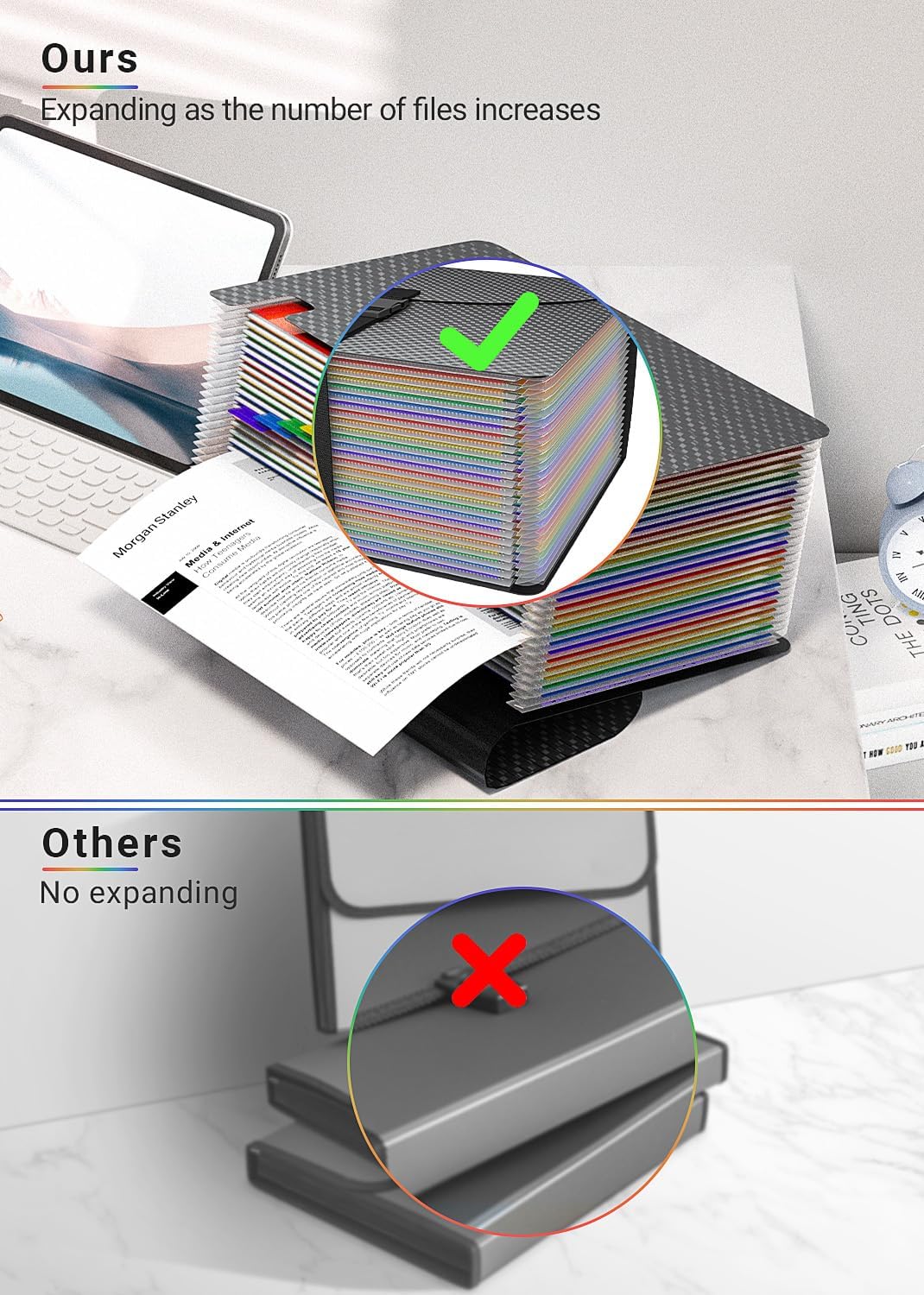 - ✔【SAFE MATERIALS】Expandable file folder are made by high quality polypropylene and polyester, 20% and more thicker than other file folders, it can stand on the desktop independently, no easy to be broken and deformed. 100% Waterproof, Non toxic, Non Odor, Anti-wear, tear and Moisture resistant.