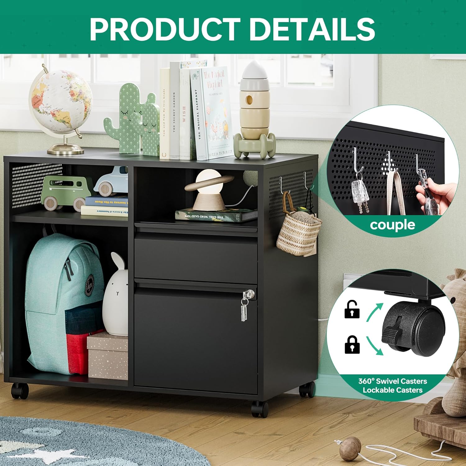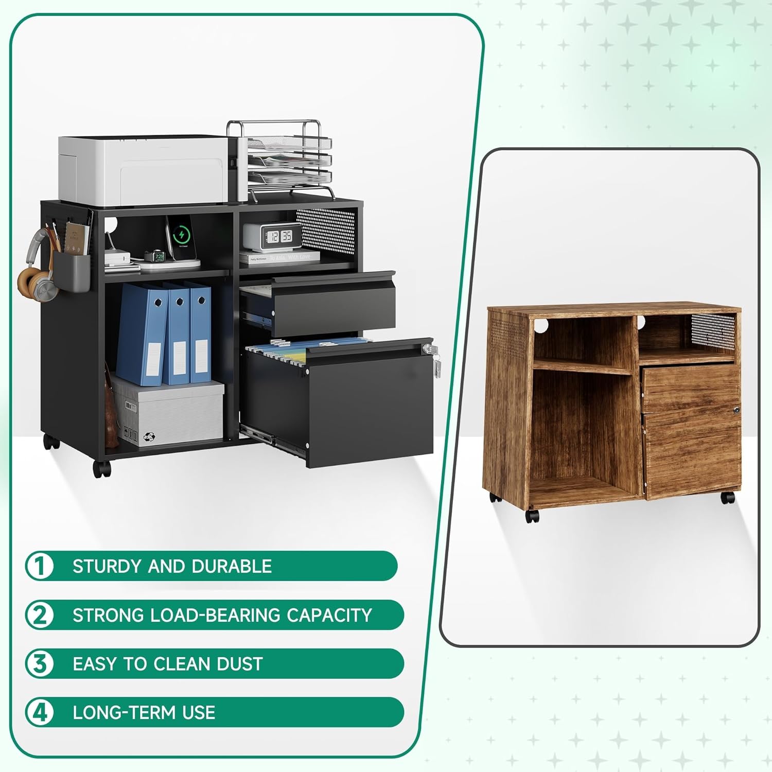 - 『Easy to move』4 removable wheels- printer stand can be moved and adjusted in position freely,2 wheels lockable to keep cabinet stable;Drawer with lock ensure the safety of items.