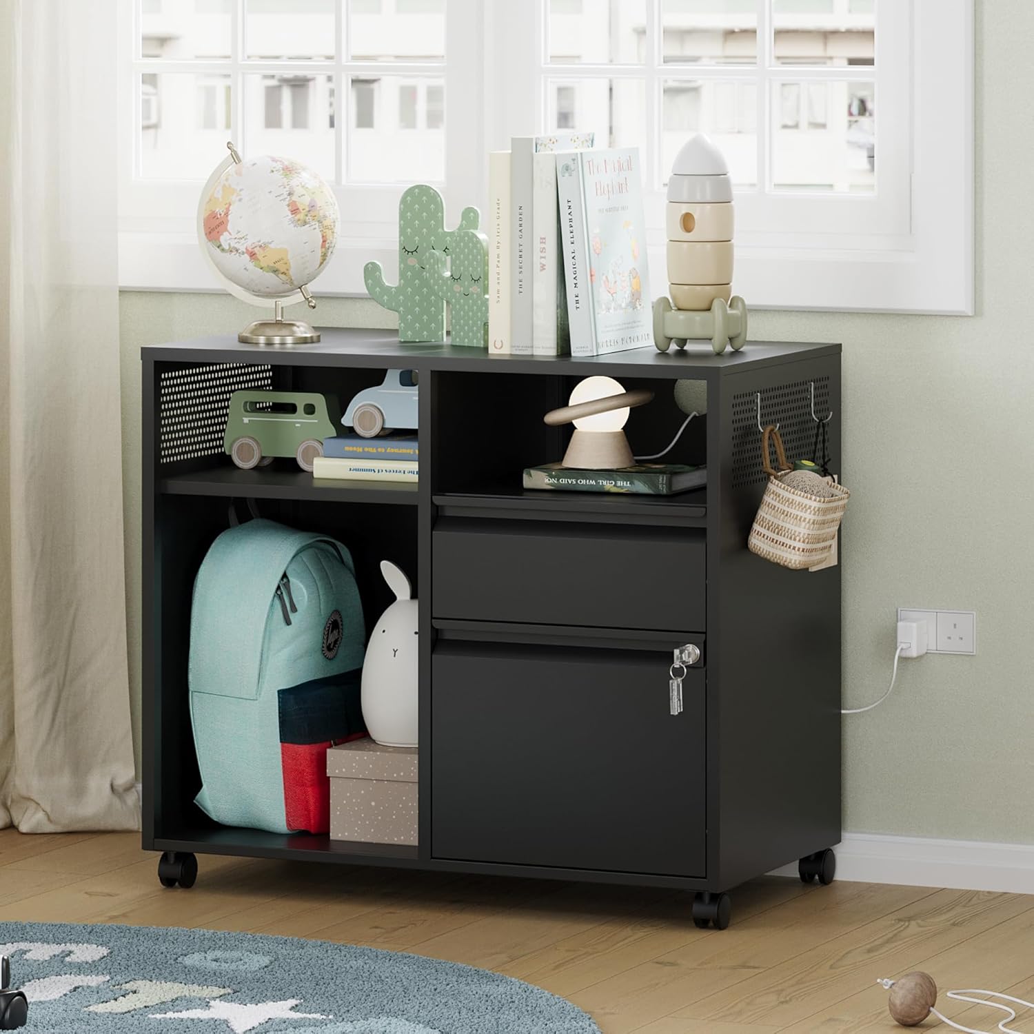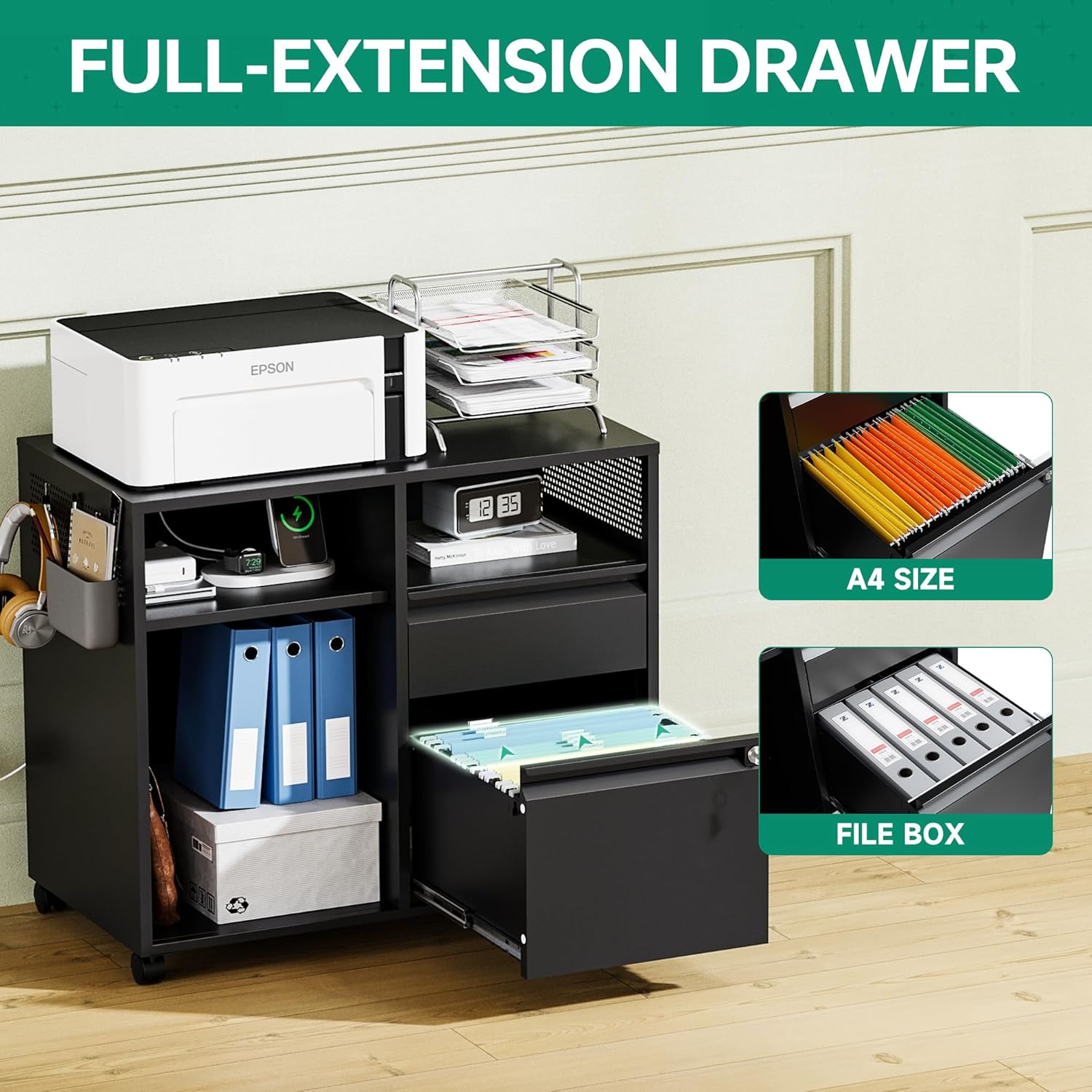 - 『Multifunctional Filing Cabinet』Lateral filing cabinet with open storage spaces, organization and storage drawers,holds printer stand and office craft storage,side hole panel design is beautiful and can hang items,modern delicate appearance ornamental to your office & home.