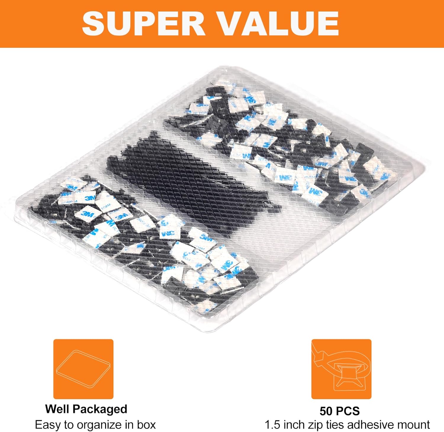 - 【Slim Fit and Innovative Design】:This Zip Tie Adhesive Mounts is 1.5 inch and is basically suitable for any place. It is composed of 50 pack cable ties and 50 pack cable mount. You can use cable ties to fix some cables alone, or you can combine the fixing brackets to fix. It has the latest creative design. More practical! It can be locked by adjusting the sliding band, and the carefully designed sliding mode makes it more flexible and effective when used.【Slim Fit and Innovative Design】:This Zip