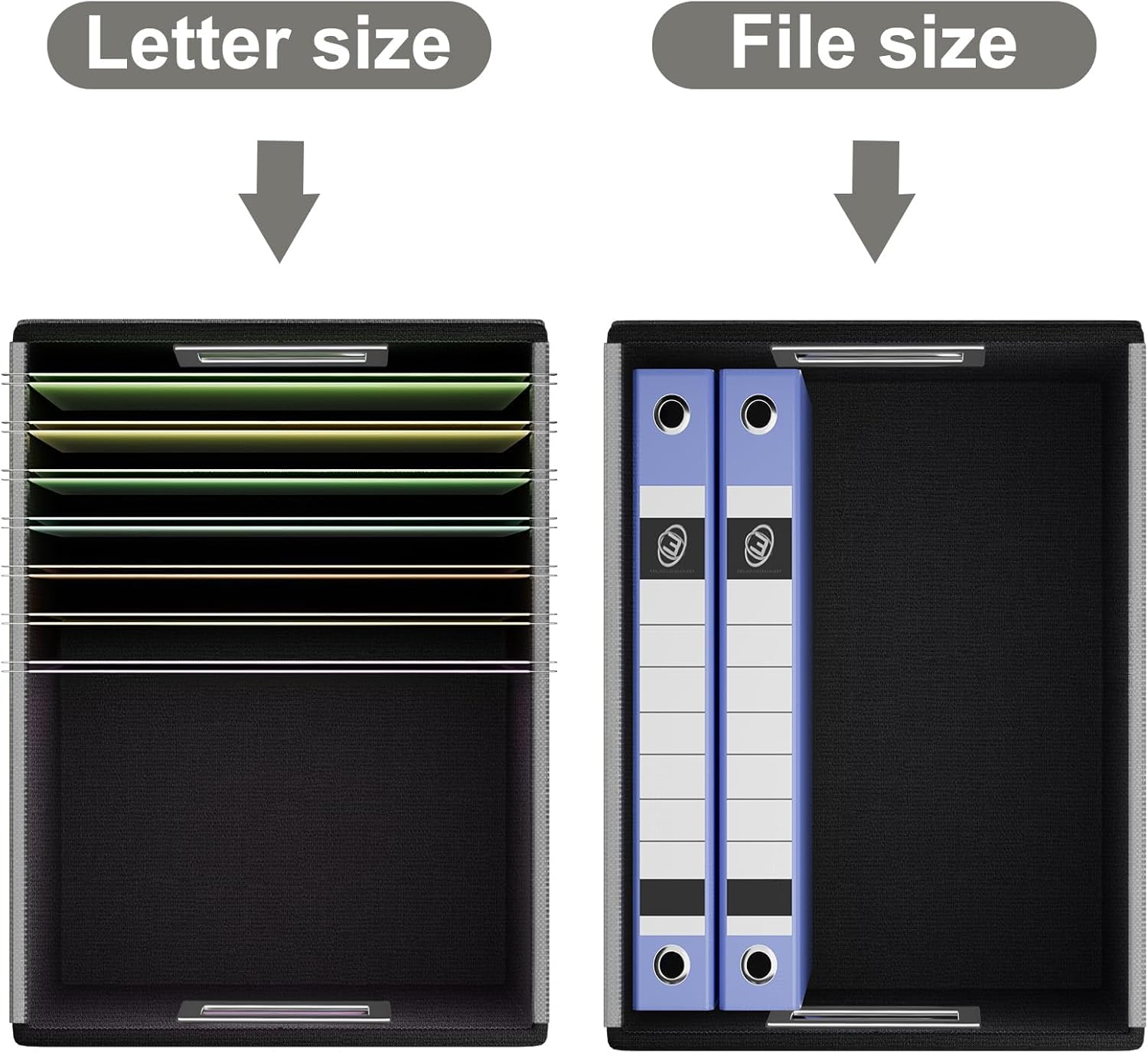 - Unique Functional Design - this file boxes both sides are equipped with practical PVP slide rails, which can not only prevent the two sides of the file storage box from loosening, but also facilitate the sliding of the file folder, which is very suitable for hanging file folders. The metal handles on both sides allow us to easily move the storage box, and the label slot on one side facilitates classification. Functional features and a beautiful design create the best filing box organizer.