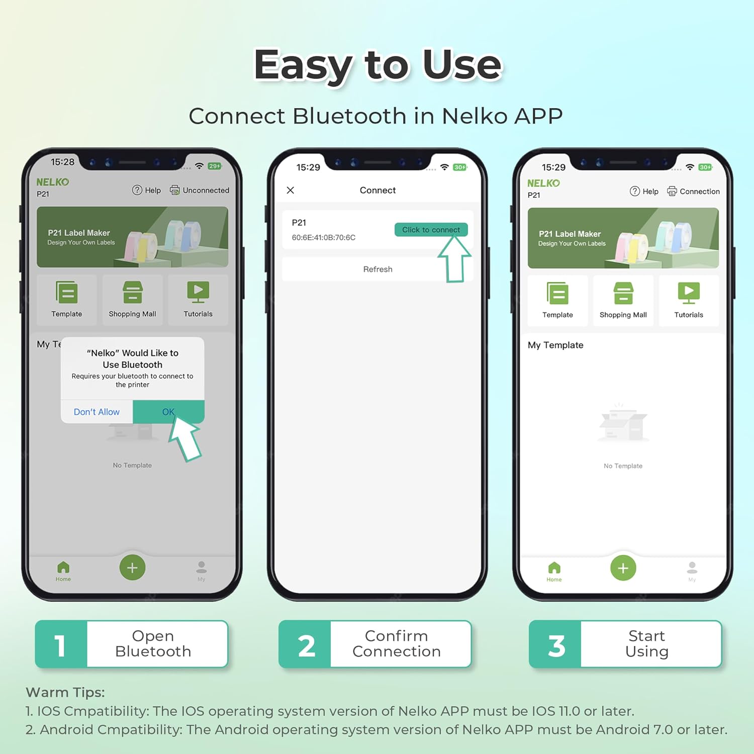 - Easy to Use: NELKO label printer compatible with IOS & Android Phone via bluetooth connection. Step 1: Download "Nelko" APP from Google Play or App Store. Step 2: Install the paper roll. Step 3: Connect the P21 bluetooth within APP. Step 4: Choose a quick template and start printing. It is not compatible with Google phones on Android 14. This label maker machine with tape APP included more than 90 +Fonts, 10+ Languages, 450+ Materials. (Note: This label maker doesn't work with computers)