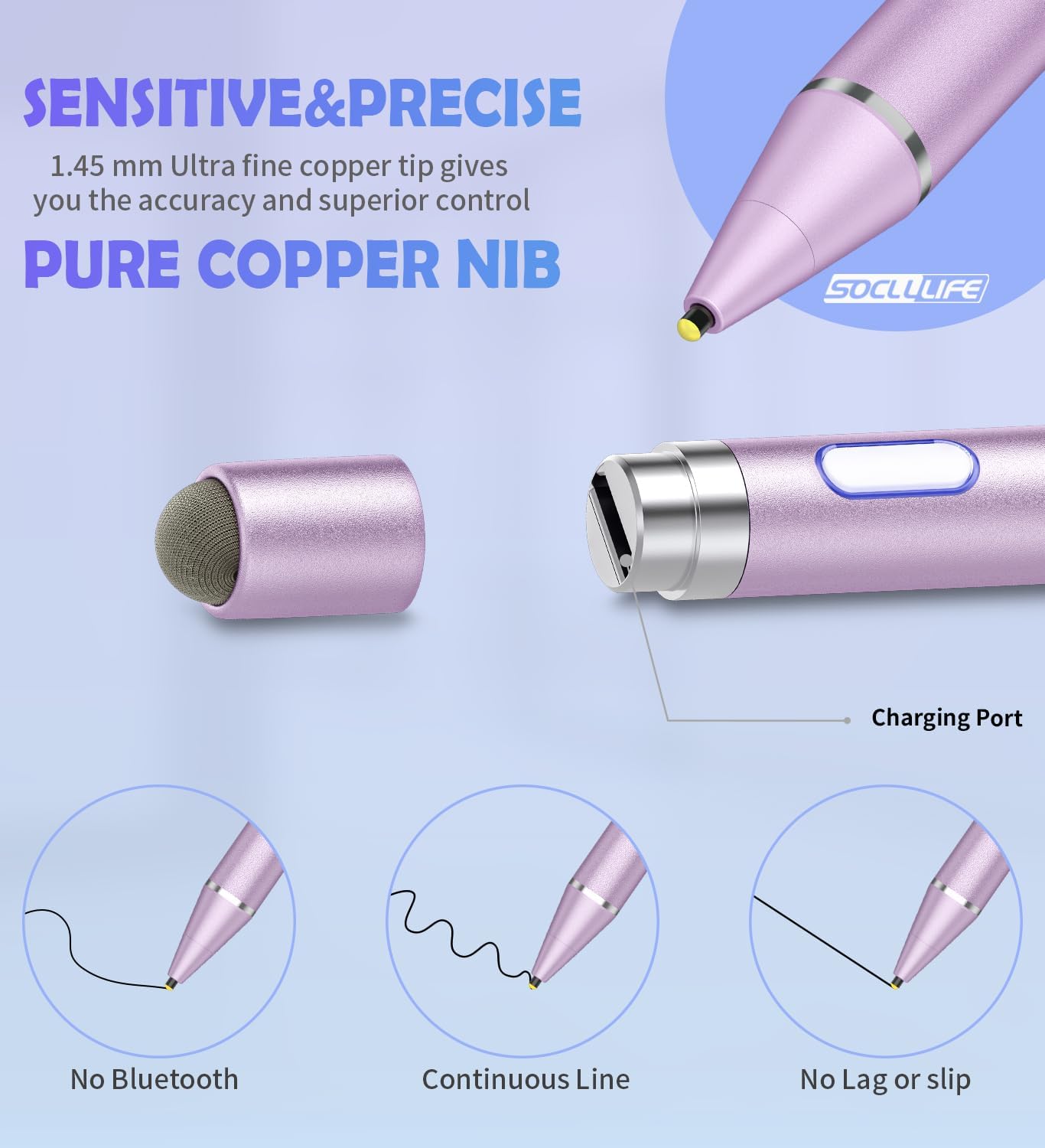 - 【HIGH PRECISION & DURABLE 】SOCLLLife stylus pen features a 1.45mm copper fine point tip, and equipped with an upgraded smart chip, making your writing and drawing smoother and more accurate, perfect for writing, drawing, note-taking. Compared with plastic stylus tip, the copper tip is more durable and no need to spend money to replace it