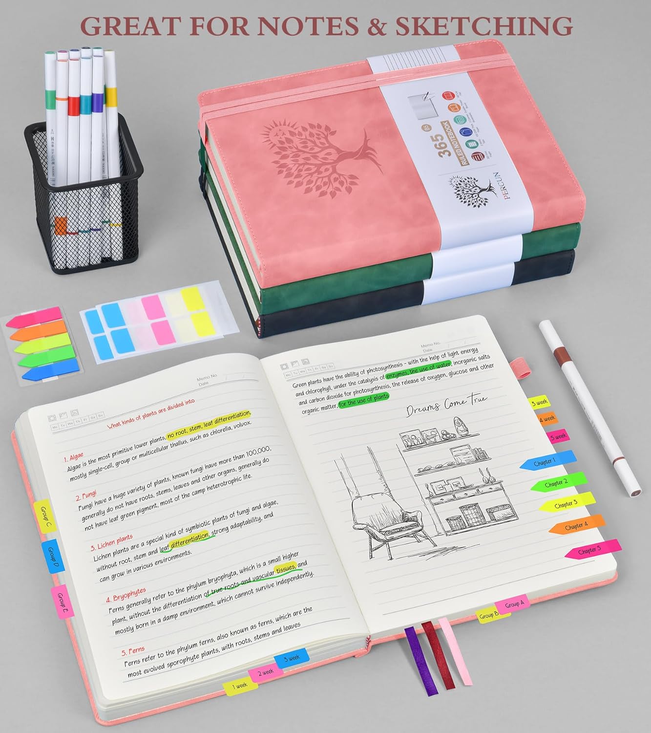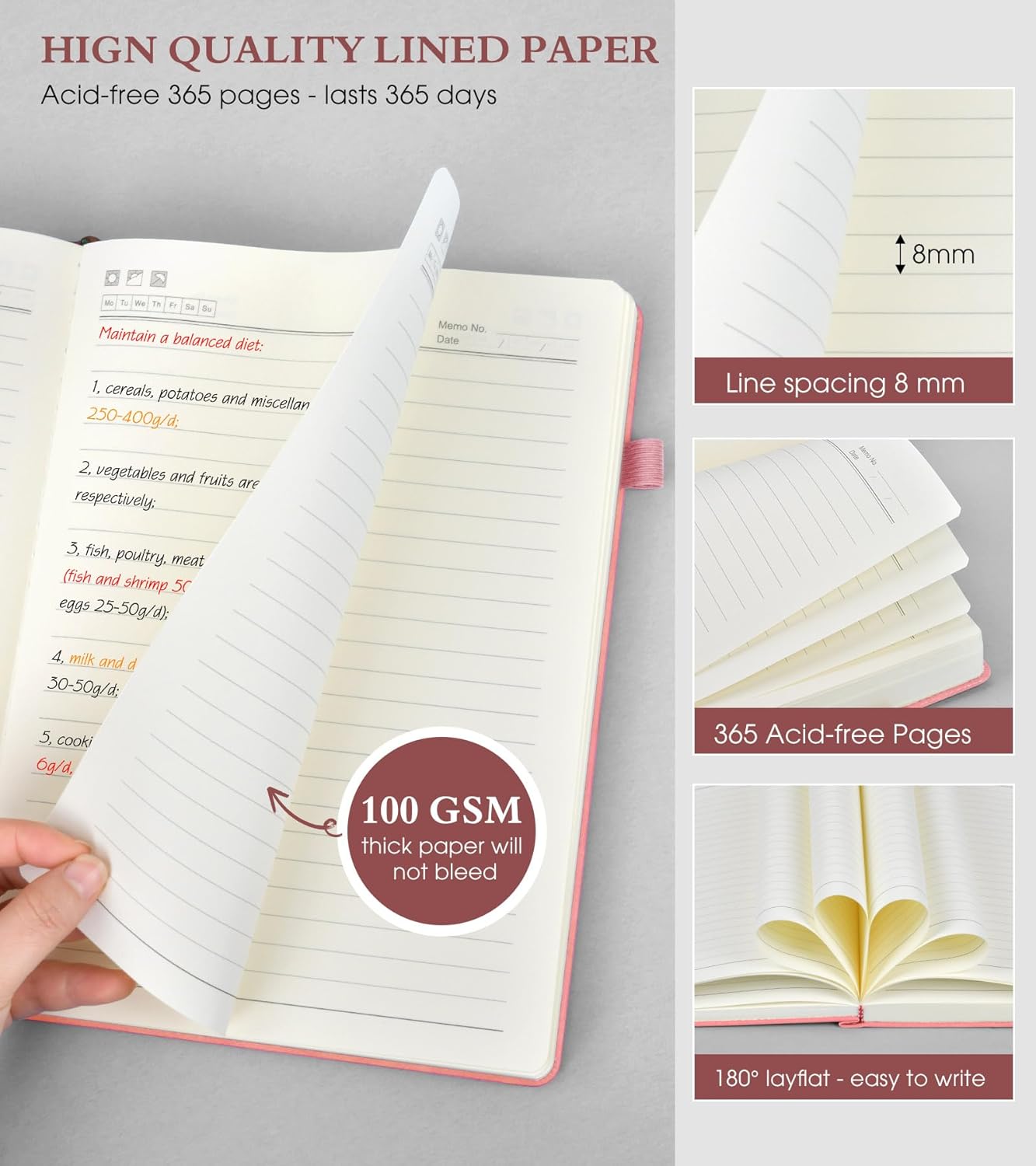 - 【365 Pages Premium Thick Lined Paper】: Our PERCUN lined journal notebook is made of 365 pages high-quality 100Gsm thick ruled pager with an acid-free light Ivory paper that is thicker than normal. This premium quality paper will not cause bleeding, ghosting or smudging and is suitable for most types of pens,provides ample space for journaling, note-taking, and creative writing. The line spacing is 7mm, making it easy to write legibly and neatly.