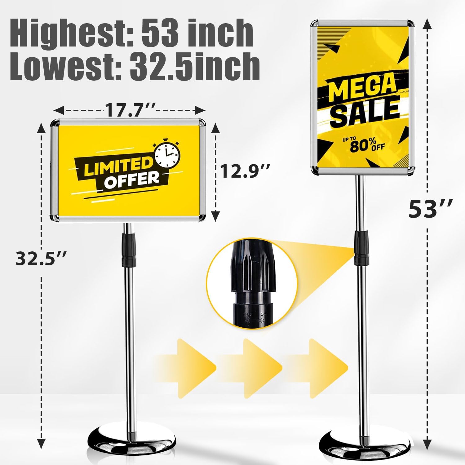 - Adjustable Pedestal Poster Stand Holder Adjustable View: The adjustable sign stand total Height is Between 32.5" and 53". Metal Pole is Suitable for Your Various Needs. The poster frame tilts and turns for any angle viewing