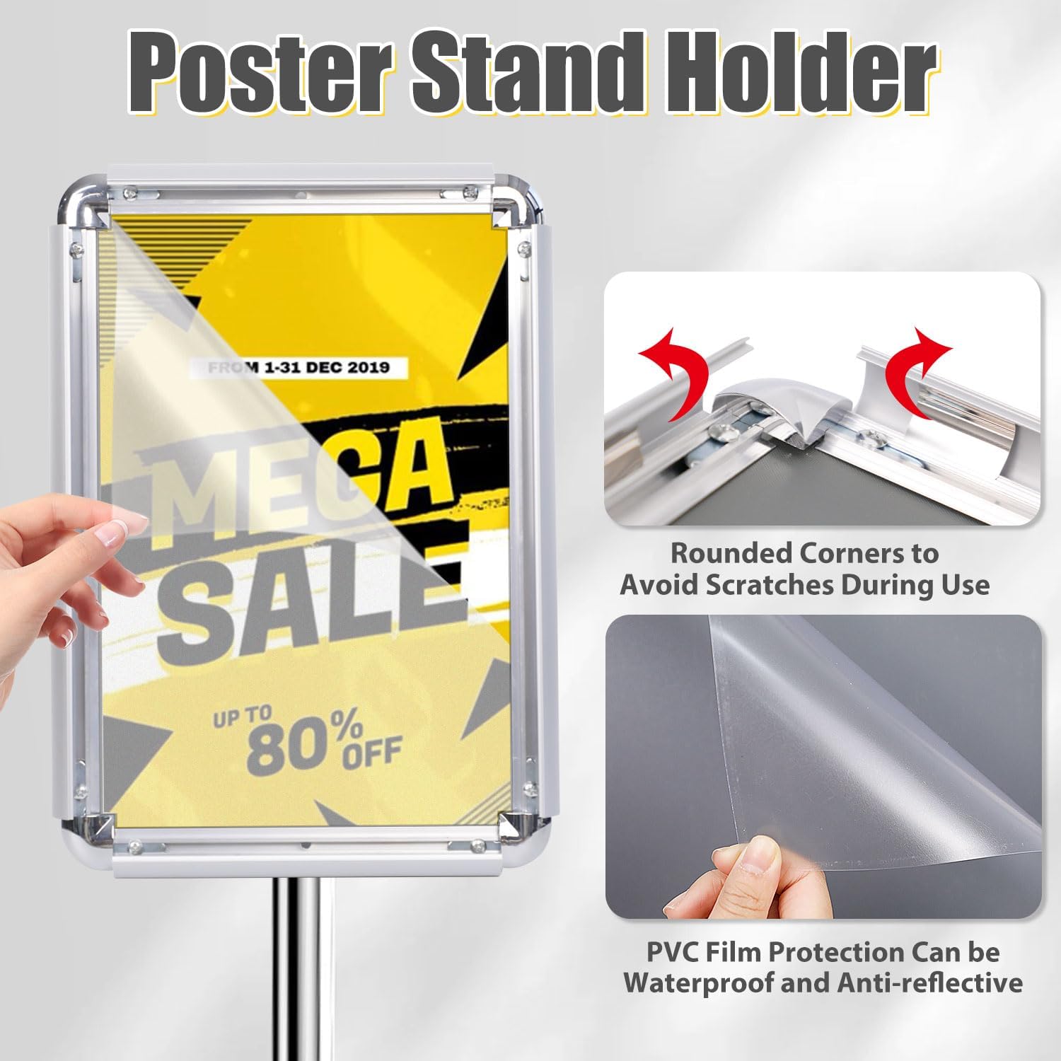 - Adjustable Pedestal Poster Stand Holder Rounded Border Frame: The sign stand features a rounded corner design to prevent scratches from edges in high-traffic areas. It securely holds 11"x17" or other sizes of posters, ensuring a stable display