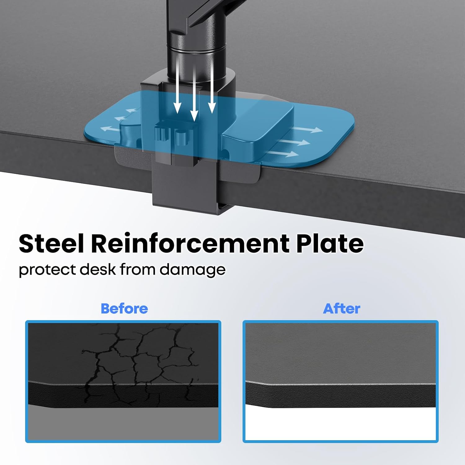 - Protect Desk from Damage and Messy:All-steel reinforcement plate kit safely disperse the monitor weight across larger area, prevent distortion of the mounting part and protect your desk from damages and scratches. Included cable clips delivery maximum tidiness, even the Allen key can be tidied away under the cover so that you always have it ready.