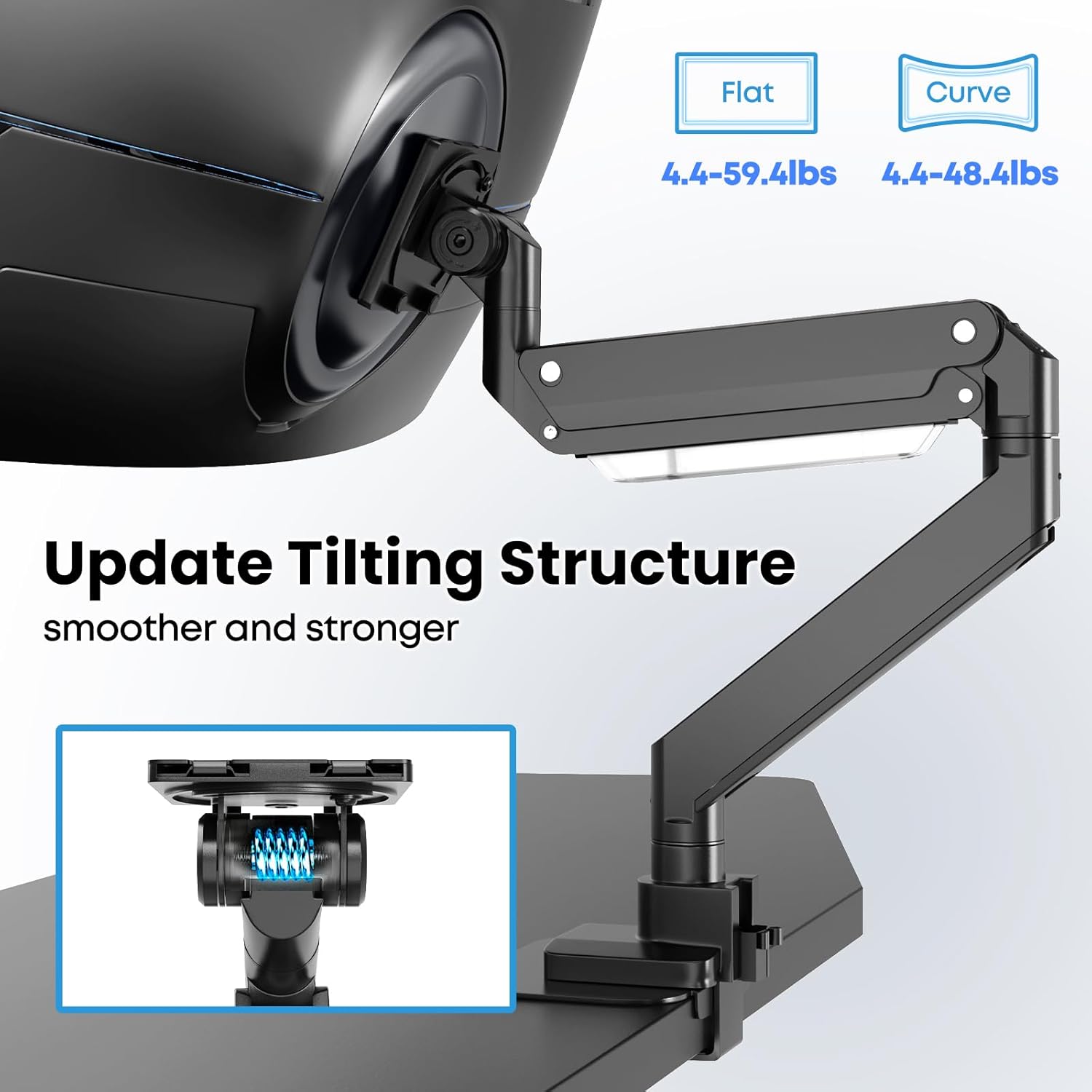 - Solid Monitor& TV Desk Mount: With upgraded tilting structure and reliable gas spring construction, our premium aluminum heavy duty monitor arm can hold flat screen up to 59.4 lbs and curved screen max to 48.4 lbs stably. Become a good workstation for your office, game room, bedroom, living room and etc.