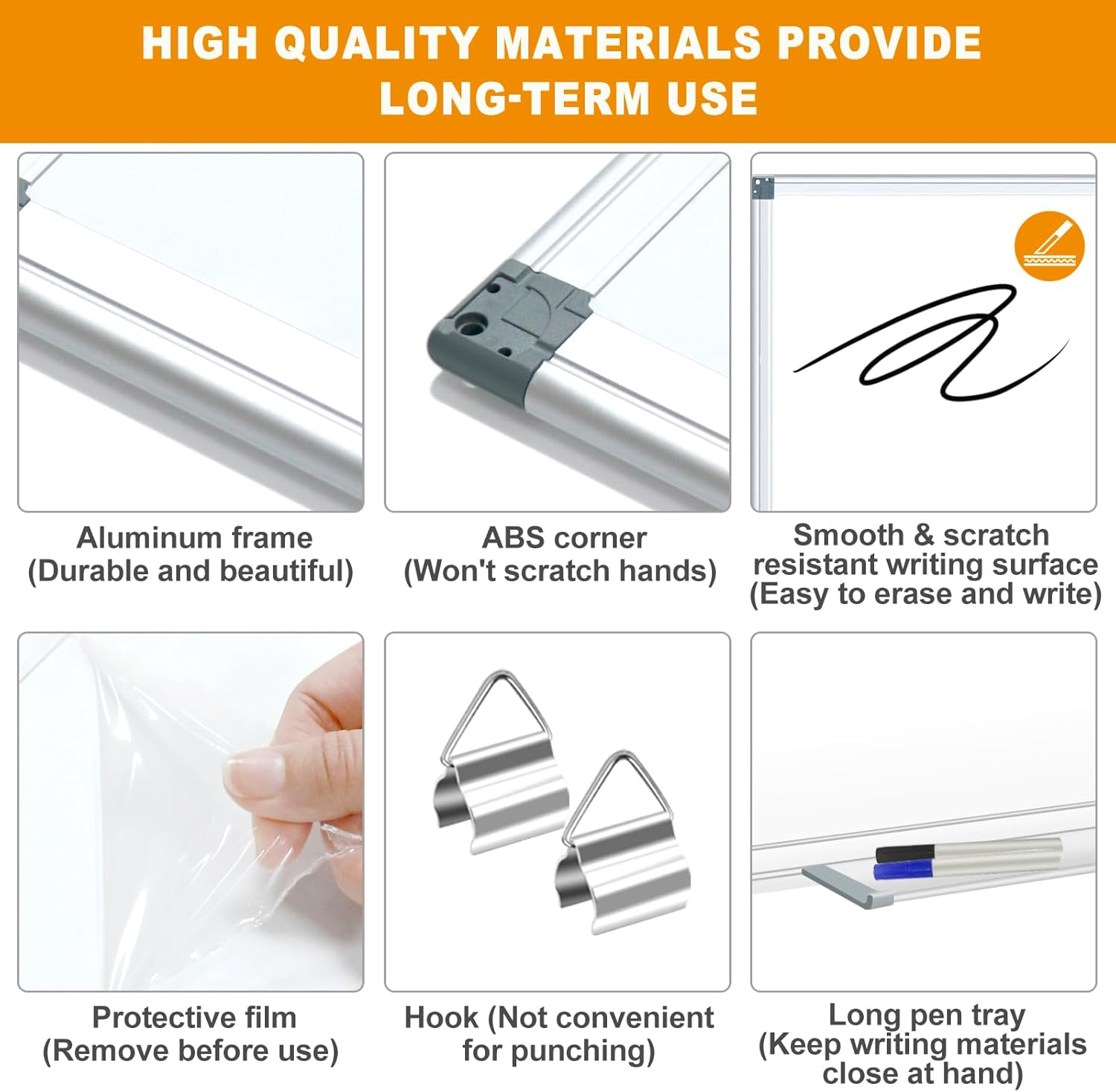 - The dry erase white board is made of high grade sturdy aluminum frame built with ABS plastic corners, no worry about pointy edges.