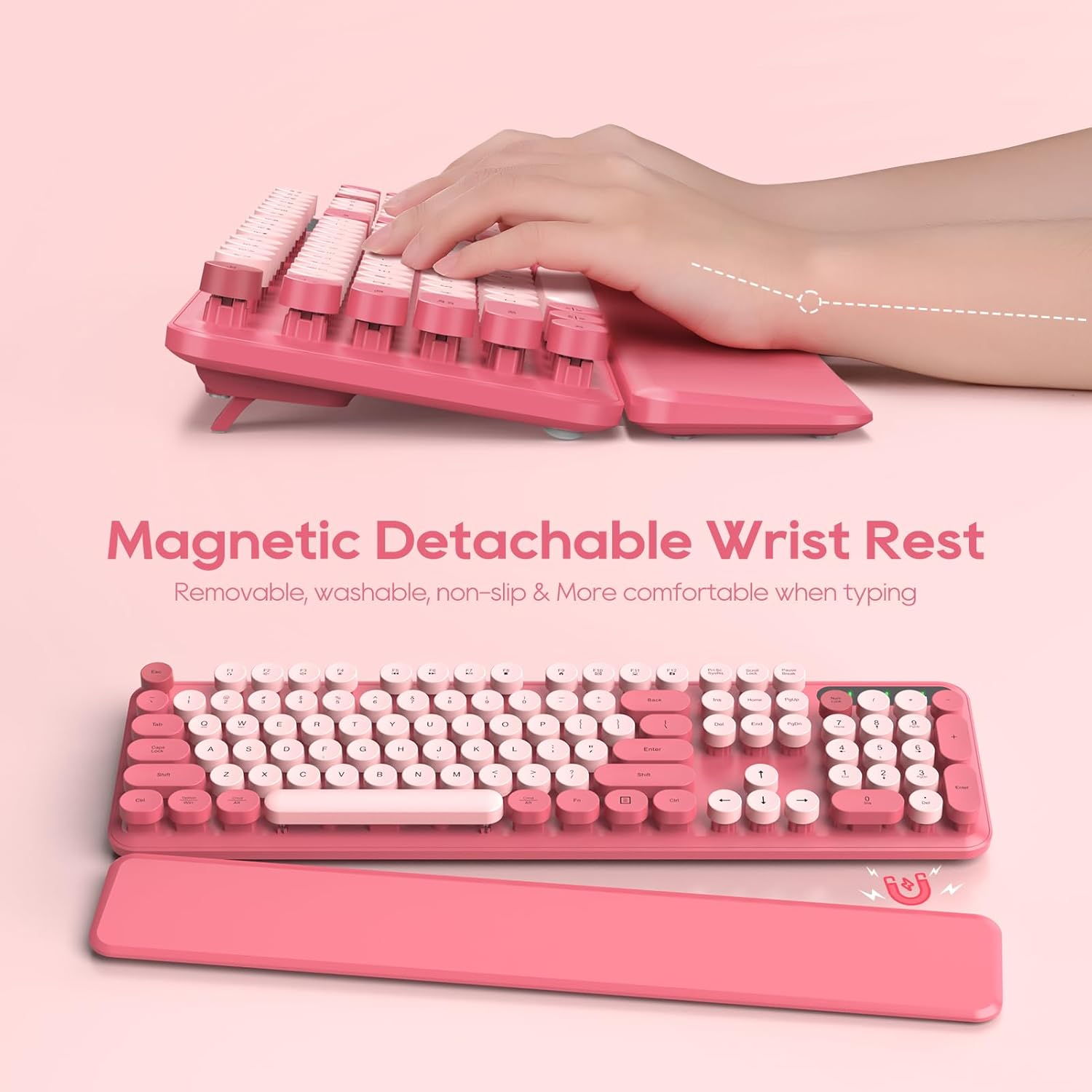 - Special Feature : Magnetic Detachable Hard Wrist Rest & Waterproof, Splash-proof Design, Removable Floated Round Keycaps & Foldable Tilt Legs, Wireless Typewriter Keyboard & Auto Sleep Mode Magnetic Detachable Hard Wrist Rest & Waterproof, Splash-proof Design, Removable Floated Round Keycaps & Foldable Tilt Legs, Wireless Typewriter Keyboard &… See more