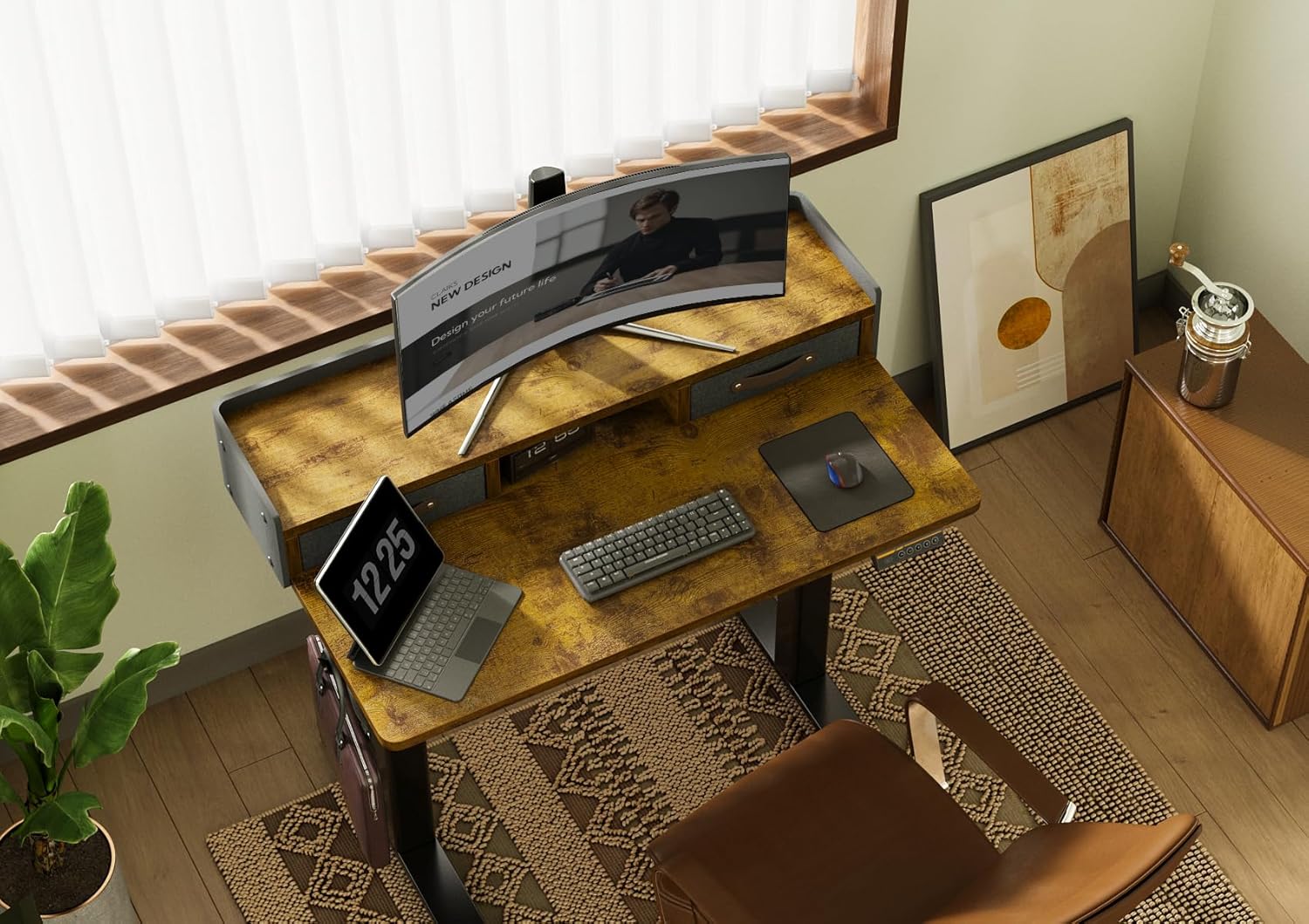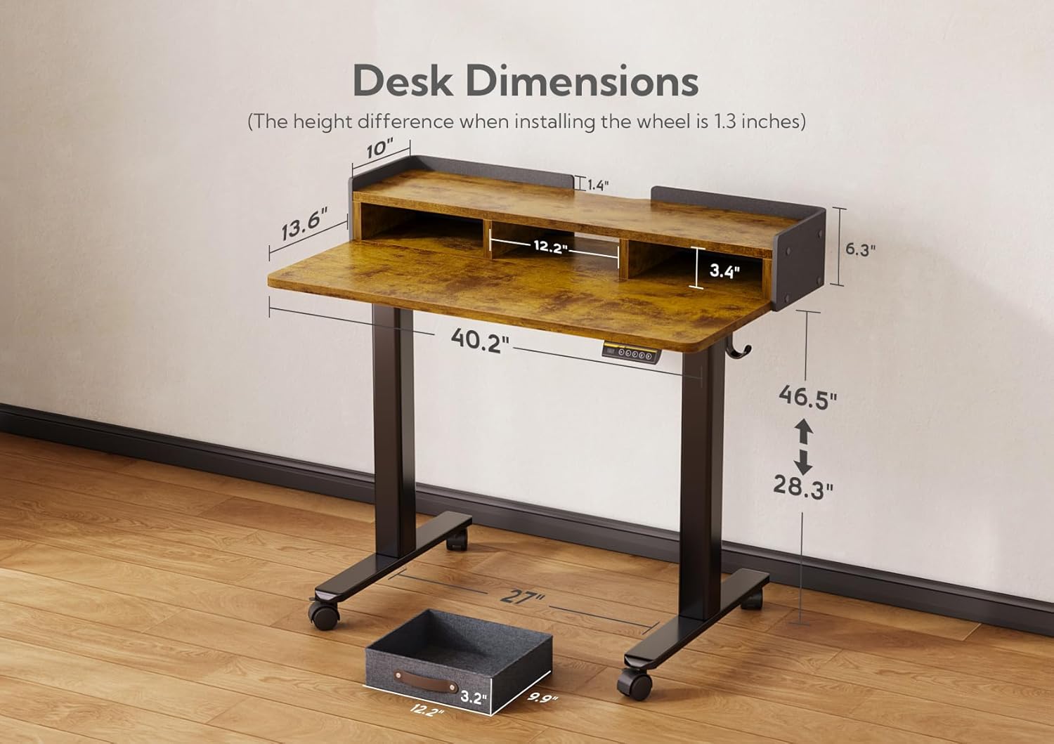Claiks Standing Desk with Drawers, Adjustable Stand Up Electric Small Standing Desk Adjustable Height with Storage Shelf and Splice Board, 40 Inch, Rustic Brown