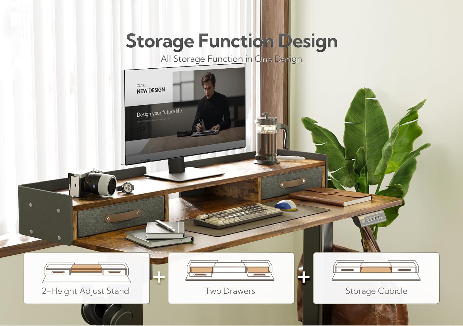 - 2-Tier Shelf Stand&2-Drawers - Claiks standing desk with storage and unique felt fence design. The mid desk top with 2 adjustable heights, provides you with a more ergonomic way to view your monitor. 2 tabletop drawers provide more storage & organize space for a variety of home office tasks.
