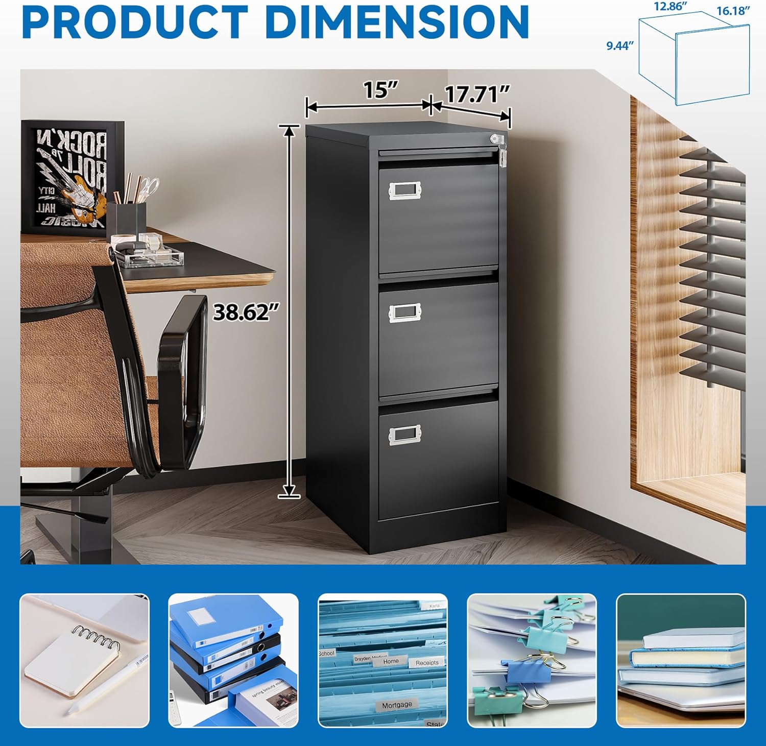 3 Drawer File Cabinet with Lock Metal Vertical File Cabinet Office Home Narrow File Cabinet for A4 Legal/Letter Size,Assembly Required (Black, 3 Drawers-Vertical)