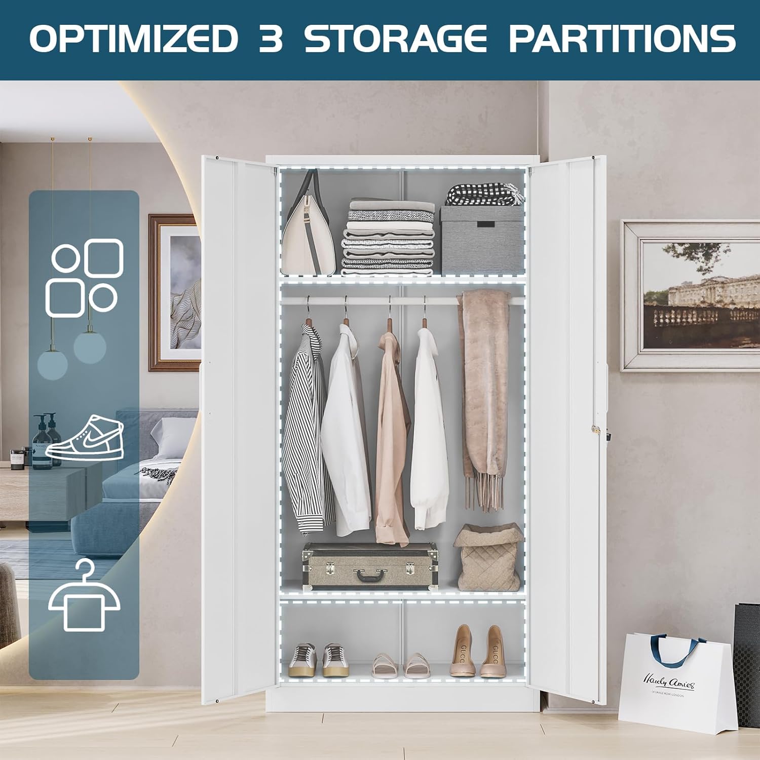 - 【Upgraded Metal Wardrobe Cabinet】: This metal cabinet add storage space in overall size: 72"H x 36"W x 18"D. The Closet Rod is made of aluminum alloy material, and it can hang more than 10 pieces of long coats. Furnished height-adjustable steel shelves, it can also accommodate bedding, luggage, cleaning supplies and tools.