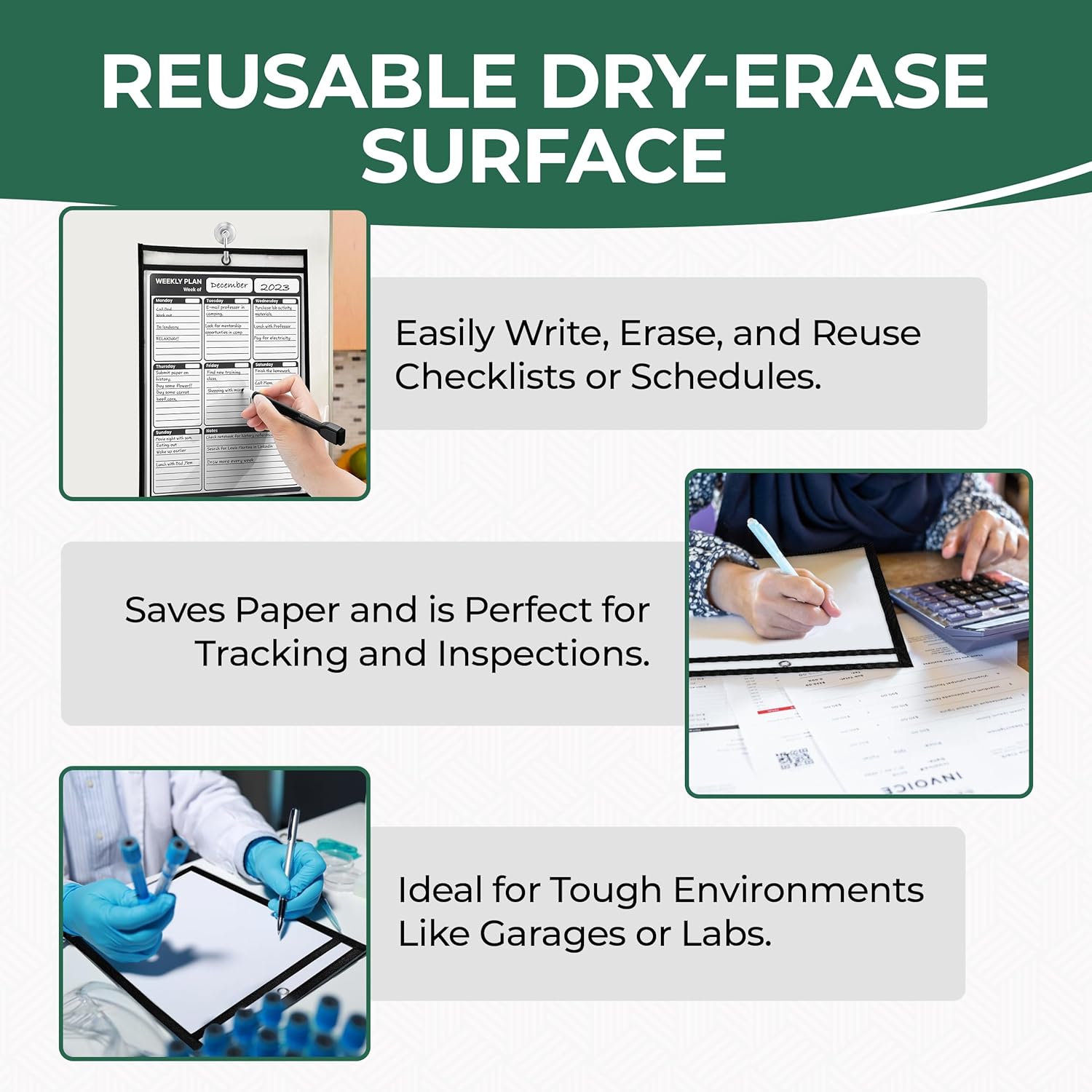 - Reusable & Eco-Friendly: The dry erase surface lets you write, erase, and reuse—no more endless copies! Save time and reduce waste in classrooms, offices, and industrial workspaces while staying organized.