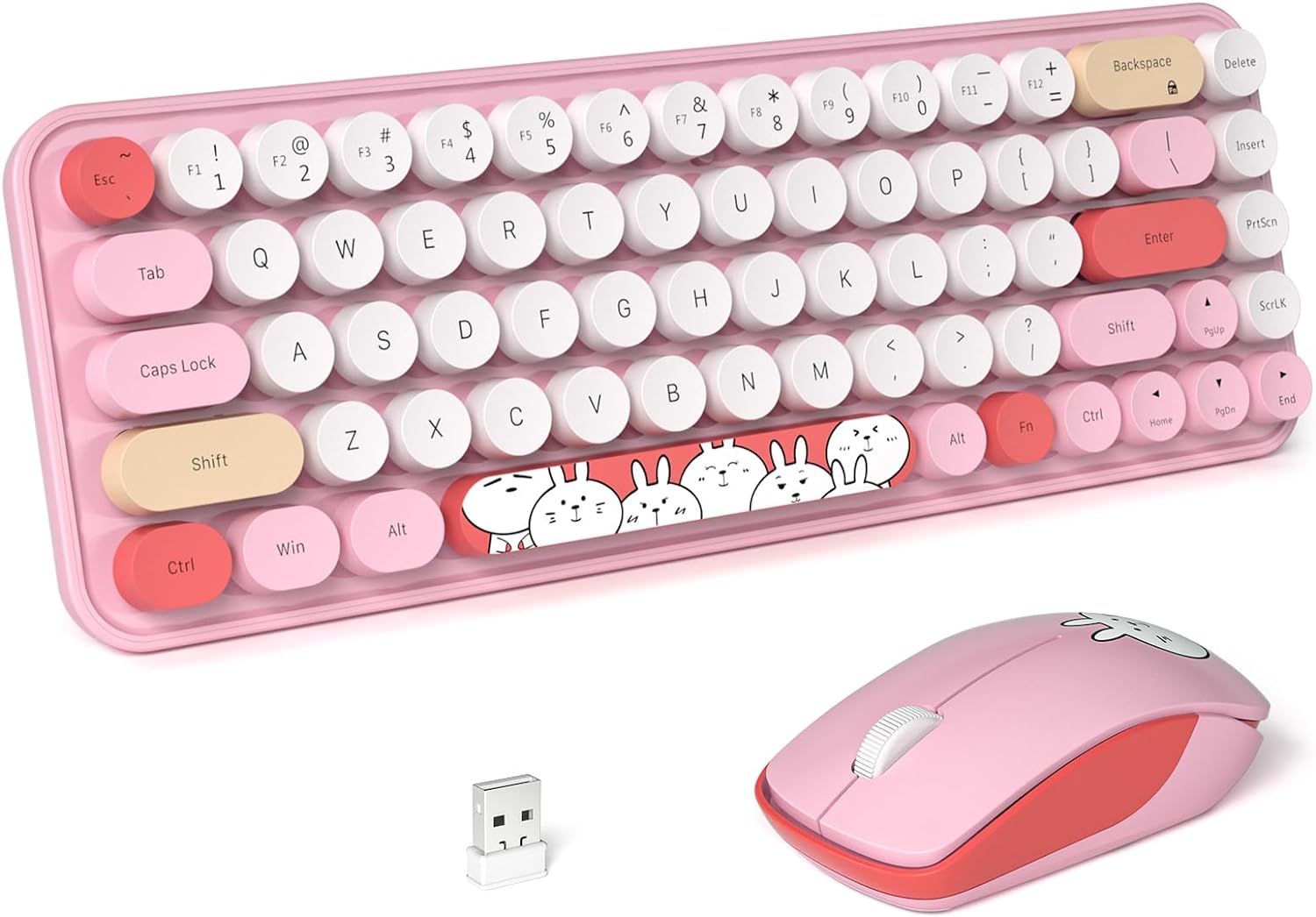 FOPETT Wireless Keyboard and Mouse Cute Mouse and Keyboard 2.4G Wireless Keyboards with Colorful 68 Keys Typewriter Retro Round Keycap for PC, Laptop,Tablet,Computer Windows - Pink Colorful