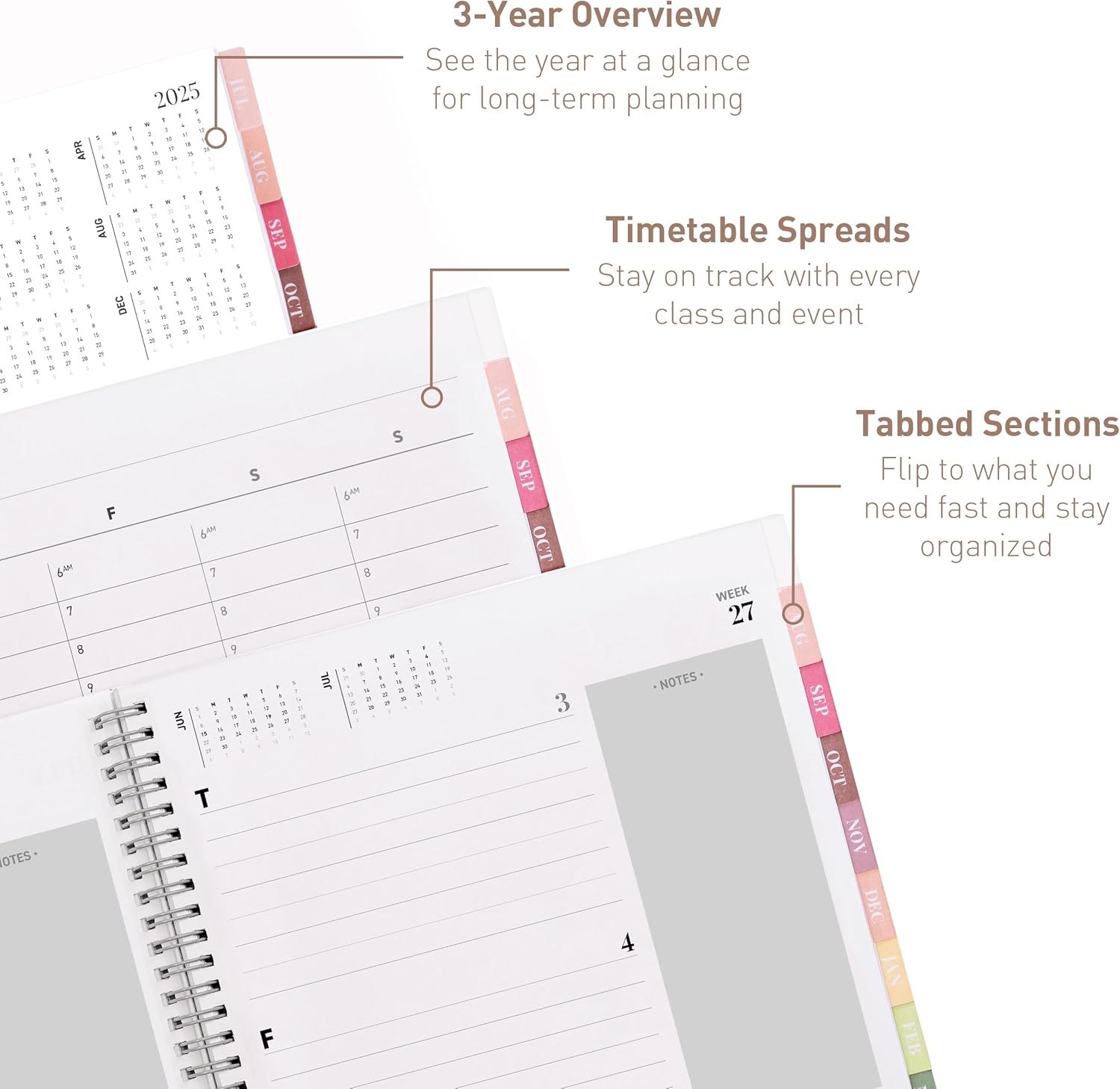 - STAY AHEAD WITH BUILT-IN EXTRAS: Never miss a milestone again. This sleek calendar 2025-2026 includes holidays, a full 3-year overview, and forward-looking weekly layouts that preview the next month. A reliable 2025 planner that keeps your future visible, from family vacations to project deadlines. Feel the peace of knowing everything’s under control.