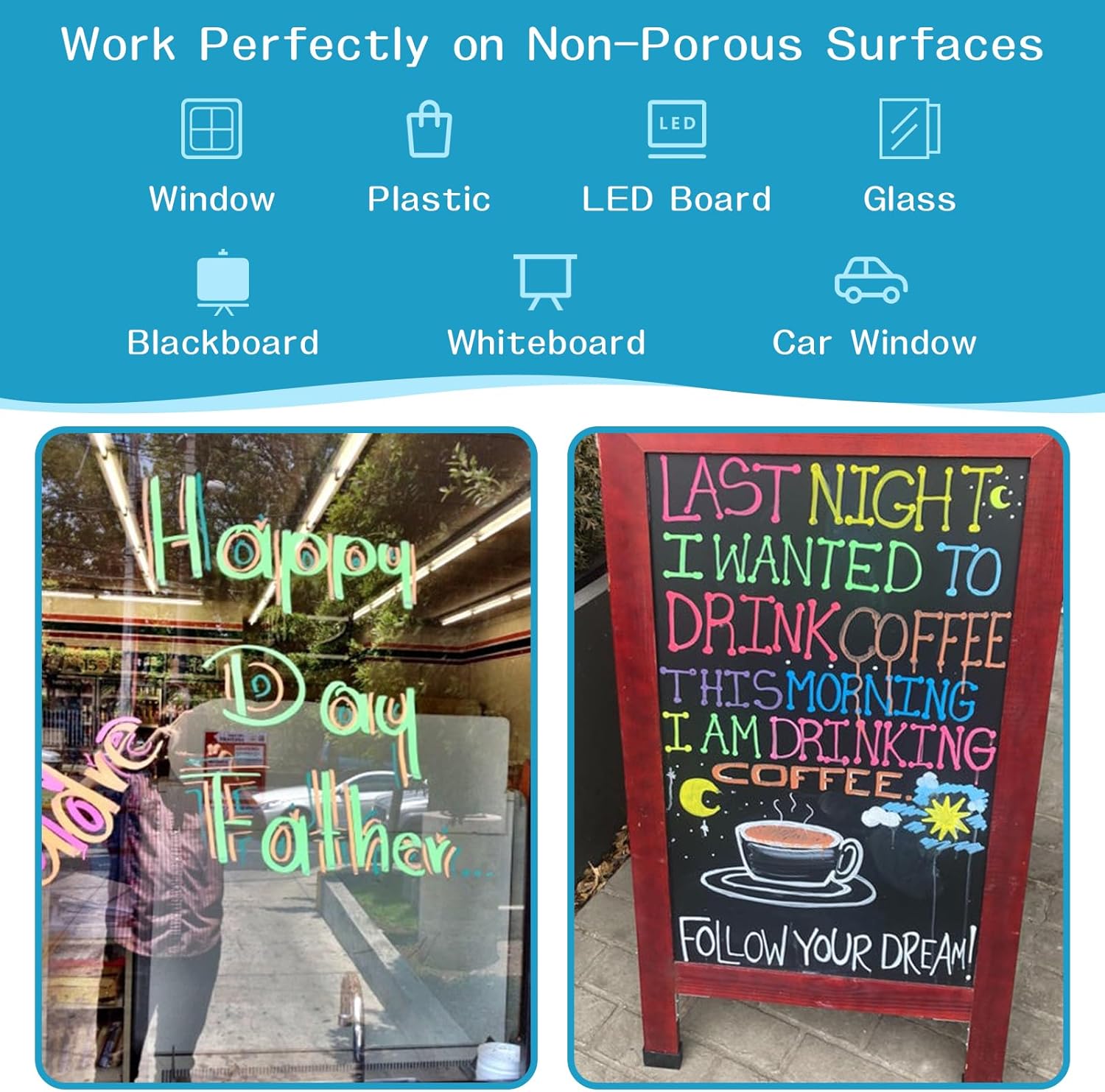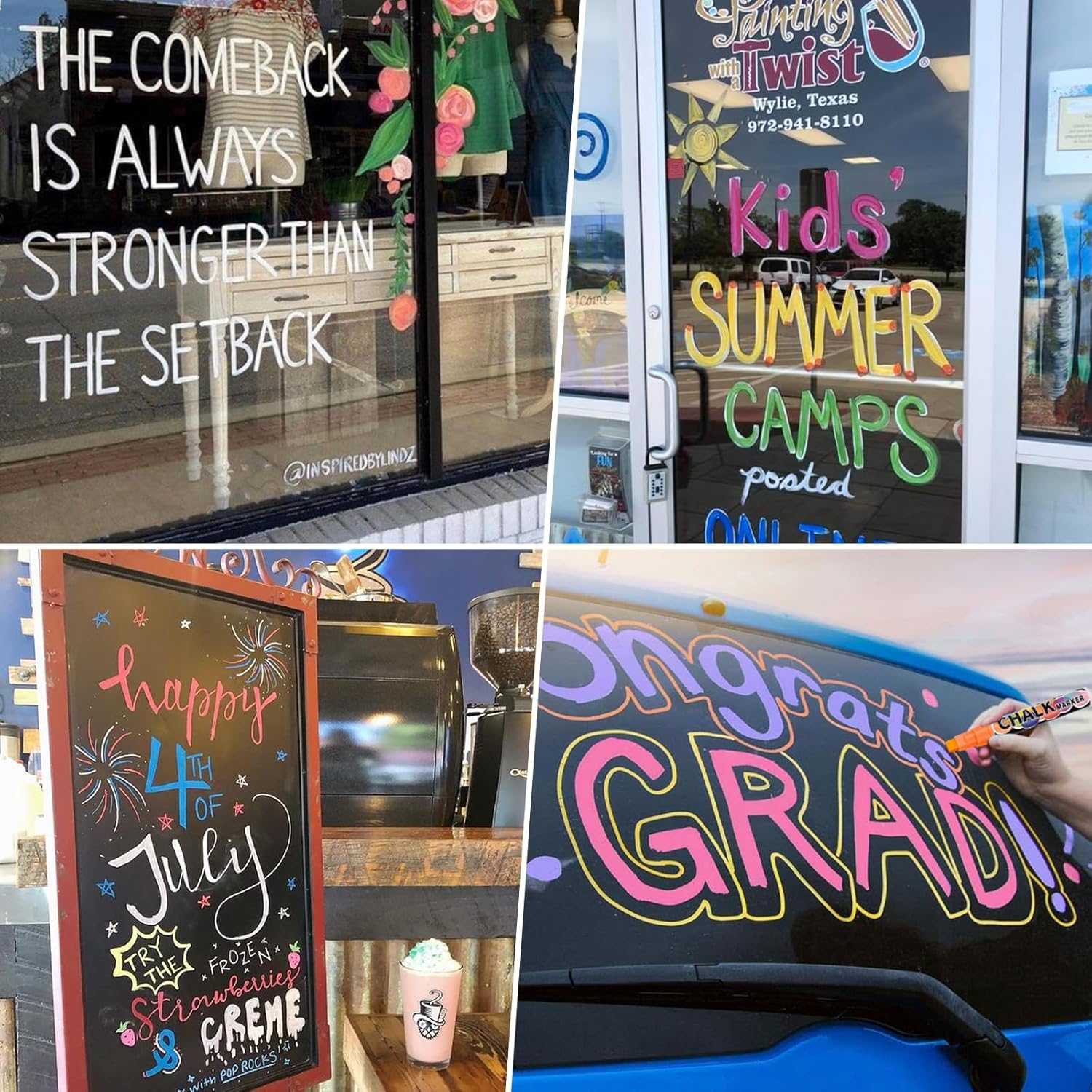 - 【3-in-1 Nib Jumbo Chalk Markers】With a 10mm thick tip, Car window markers write smoothly without needing multiple passes or filling in letters. Adjusting the angle gives you three line width options: wide, bold, and fine lines, meeting your everyday needs. Window marker for business perfect for grabbing attention on display windows, creating crisp lines that are easily visible from afar. Chalk pen for windows