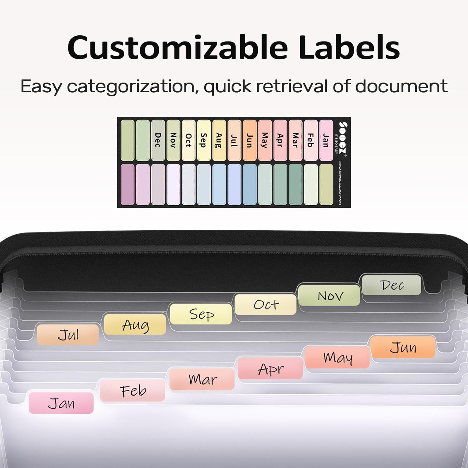 - Monthly labels for Quick Retrieval: Customizable pastels stickers and 13 tabbed pockets allow you to sort by subject or task, bonus monthly labels increase its ease of locate and access.