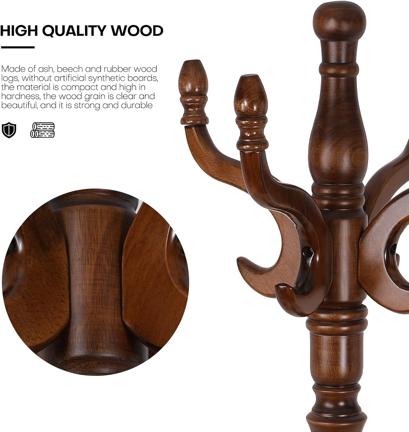 - 【Heavy Duty Construction-Extremely Stable】: This wood coat rack stand has thickened solid 3-legged base supports on the bottom for added stability and perfect balance, so it will not fall off even when shaken and can support up to 160 pounds (each hooks can hold up to 20lbs). The wood coat tree is extremely sturdy and strong enough to support coats, hats, scarves, briefcases, bags, backpack, winter jackets.