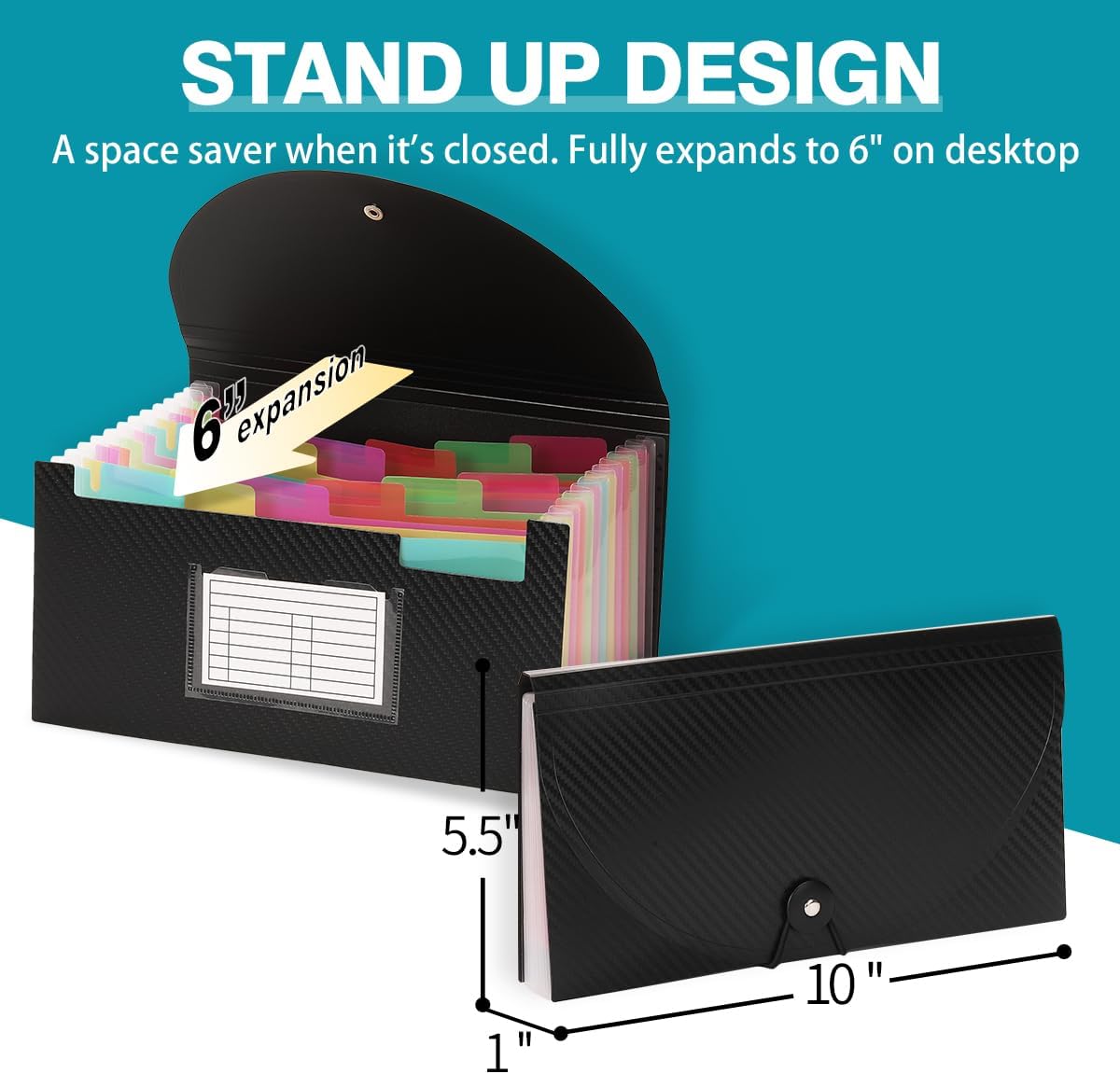 - Thirteen Pockets: Accordion folder is featuring thirteen pockets with a 6" expansion, that could stands up and expands fully on a desk or counter, contents are easy to access