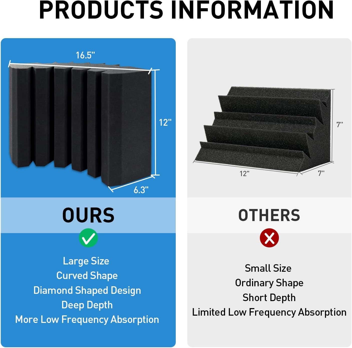 - Easy To Install: 12" X 7" X 7" bass traps corner installed at the ceilings and corners of a room will ensure the balance of the waveform in the low-frequency part of the frequency response curve. One wedge requires six pieces of tape to install your bass traps on your walls.