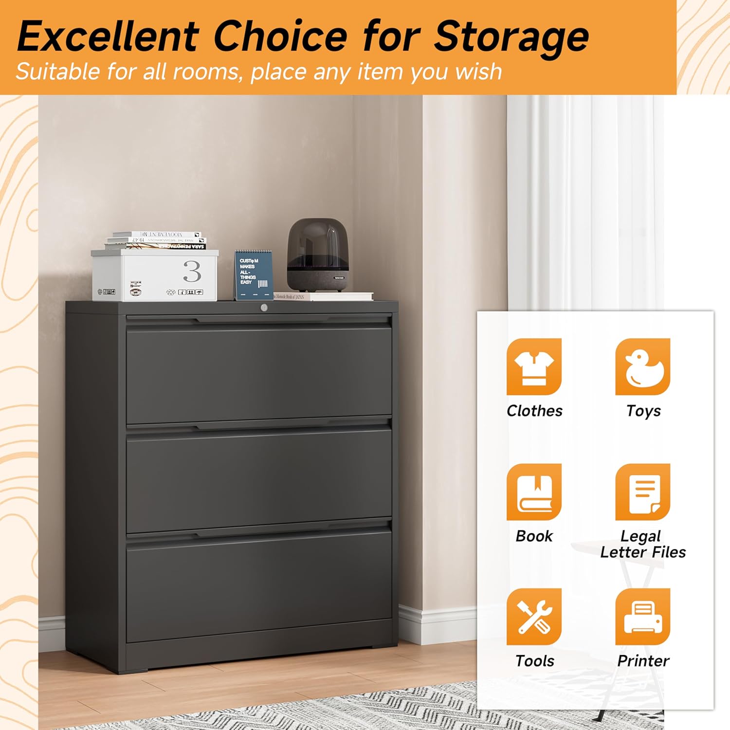 - 🪁【DURABLE ALL-STEEL METAL CONSTRUCTION】This 3 drawer lateral file cabinet is made of all-steel material, which is sturdy and durable and not easy to deform. It can hold a large amount of files! The surface is powder coated technology to prevent rust and corrosion. Perfect for long term use! It is ideal for office and home storage!