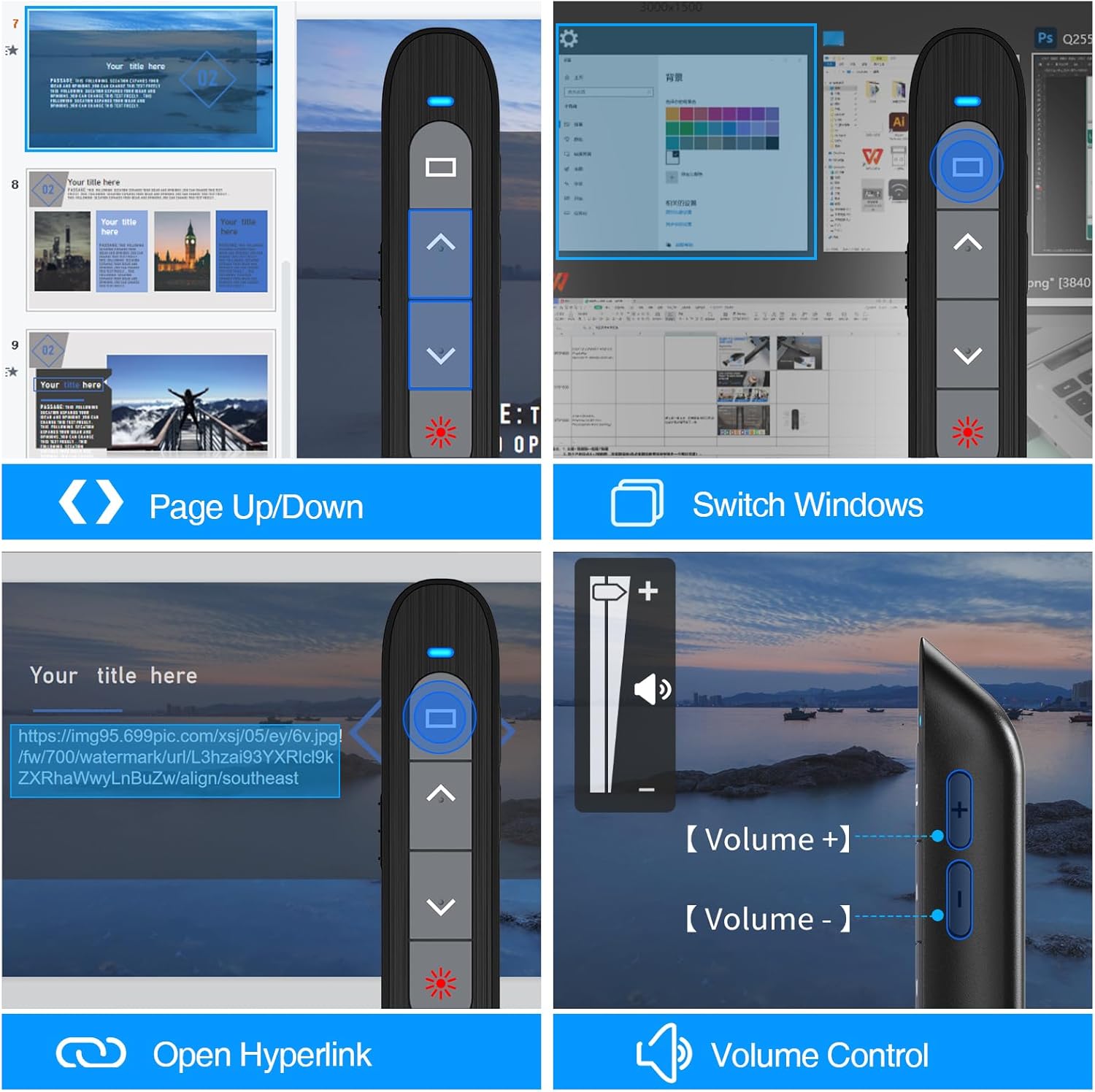 - 【Functional Remote Clicker for presentations】The wireless computer clciker for presentations combines the features of page forward/backward, volume control, switch windows, full/black screen, hyperlink; Plug and play,it doesn’t require drivers.(For Mac users, you may need to complete an simple set-up first)