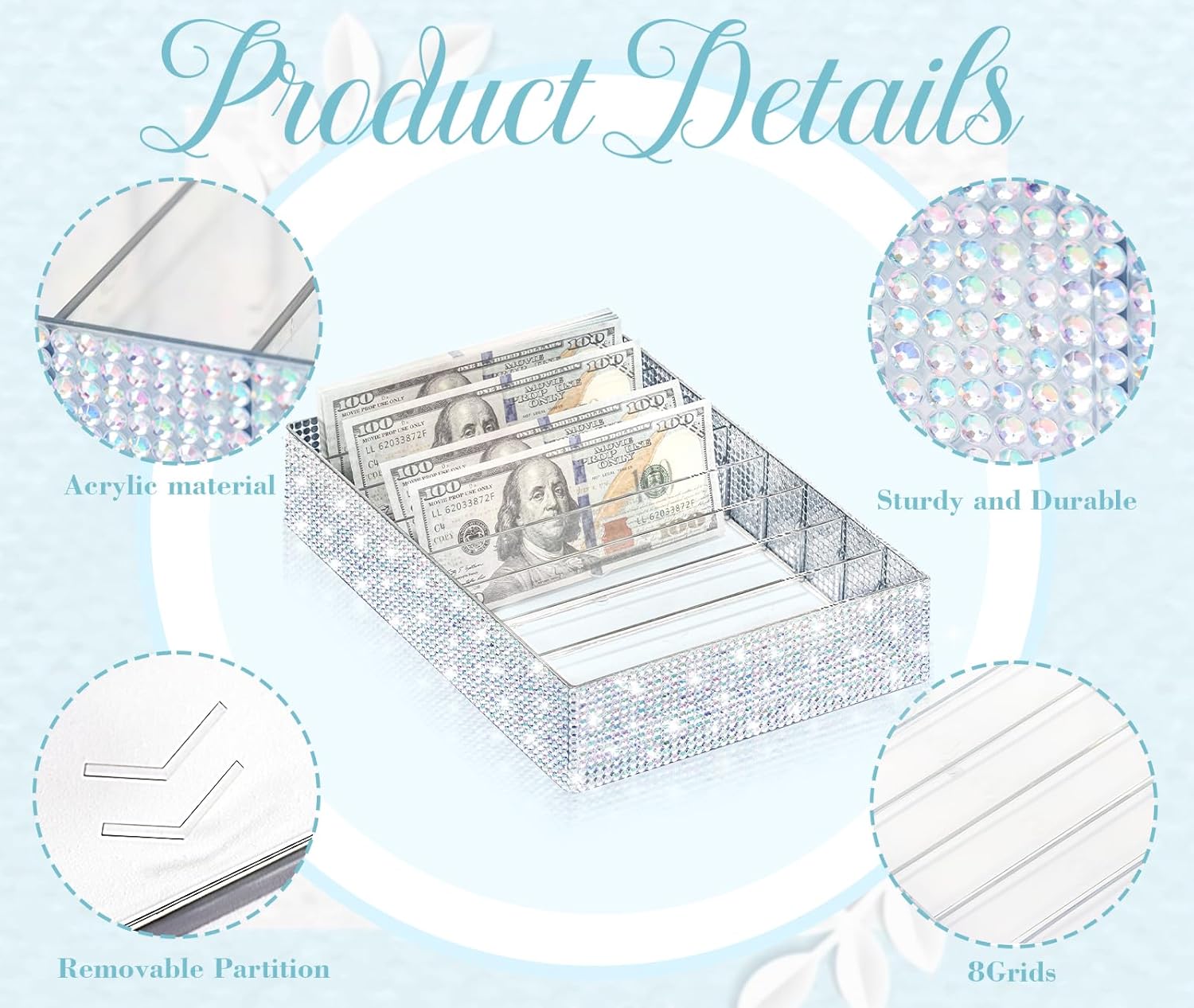 - Package includes: 8-grid clear acrylic cash organizer can meet your need to place enough cash and keep it neat and orderly. It is very convenient for you to make a budget, and can also store data cables.