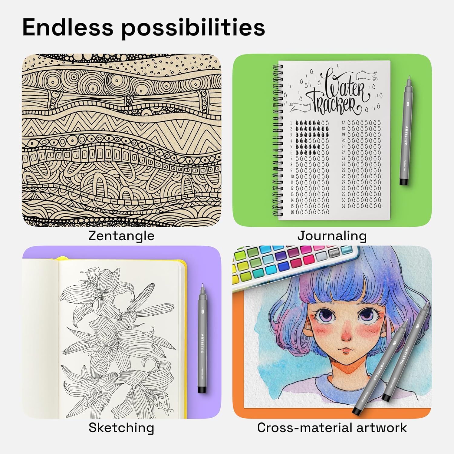 ARTISTRO Set of 2 Fineliner Pens, Black Micro Pens for Drawing, Waterproof Archival Ink, Ultra Fine Tip Pen for Illustration, Technical Pen, Sketching, Writing, Drawing, Journaling, Pair of Fine Tip