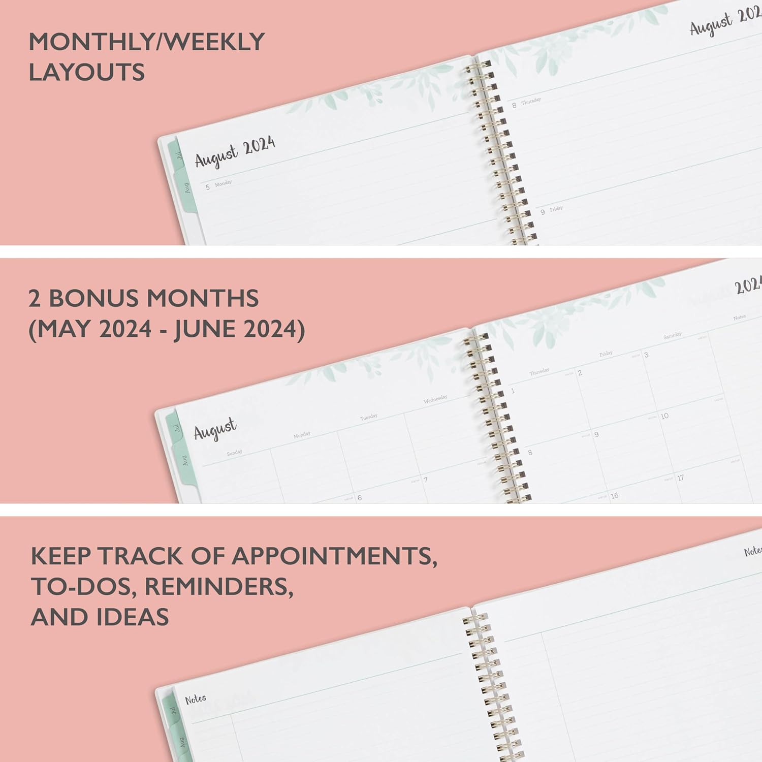 - July 2024 - June 2025 floral day planner with 12 months of monthly and weekly pages for easy academic planning and scheduling; 2 additional monthly pages (May 2024 - June 2024) are included