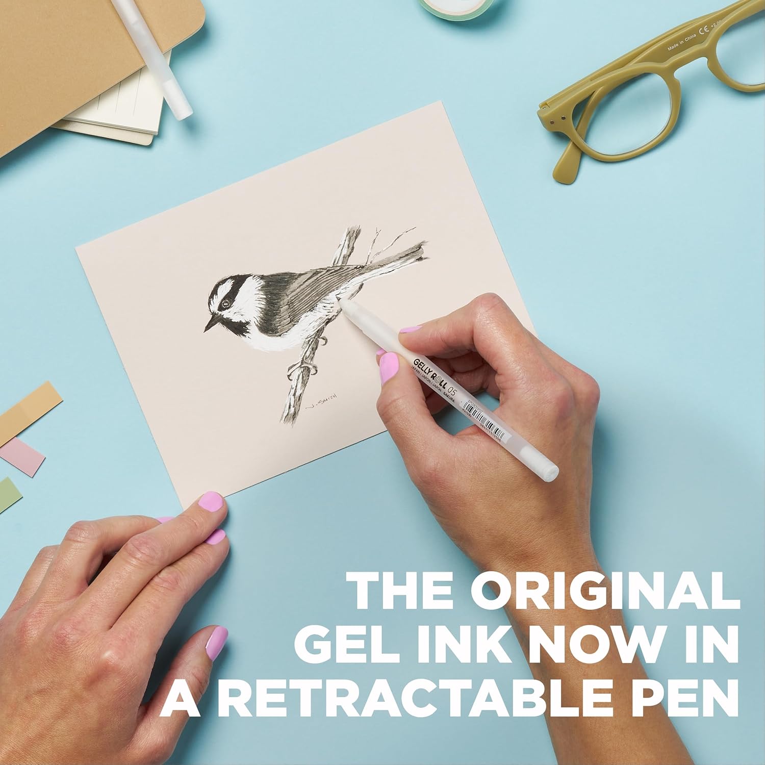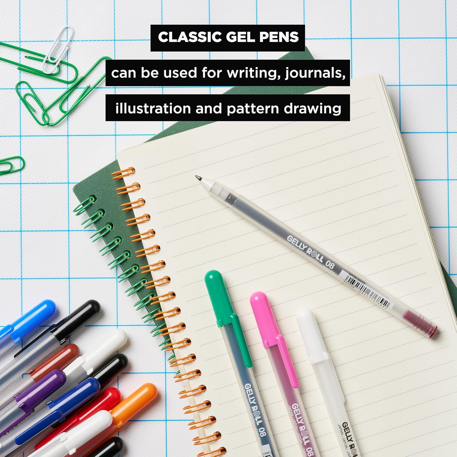 - Varied Line Sizes: Gelly Roll comes in three sizes—10 Bold for a solid bold line; 08 medium for a medium bright line; and 05 fine for a finer, lighter white line