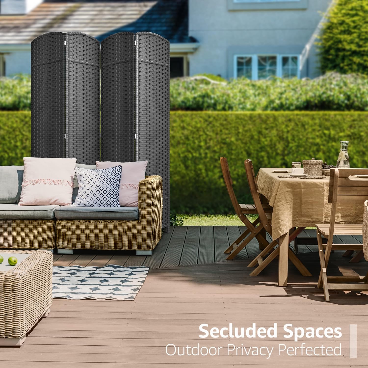 - Extra Wide Double Hinged Panels: Equipped with 4 double hinged panels and measuring 6 ft. tall, this room divider is extra wide for maximum coverage. Each panel measures 15.5 inches - When fully extended, the partition room divider measures 64 in x 69 in H - Perfect for use as a privacy screen, it also makes a great outdoor privacy screen