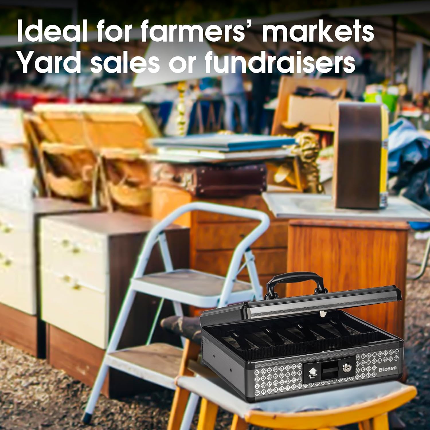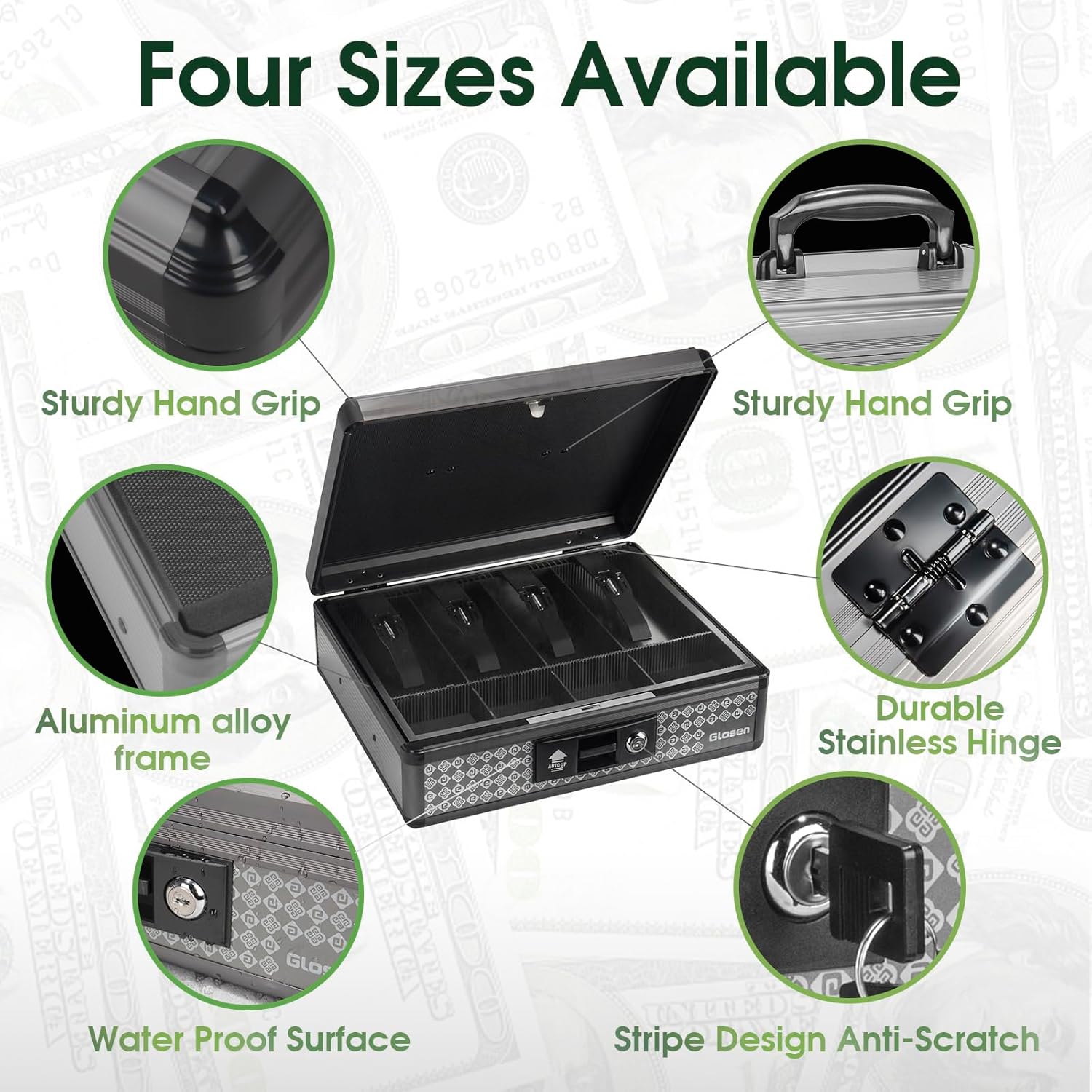 - SIZE & COLOR: The Glosen cash box comes in four sizes for you to choose from. Classic black color appearance is understated and elegant, never out of fashion, perfect lock box for corporate/personal use.