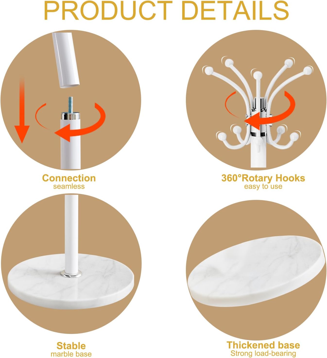 - NATURAL MARBLE BASE: SNAIKOR white coat rack freestanding base stand is made of natural marble. Every piece of marble is carefully selected, and the natural texture on it comes from the carving of nature. The diameter of marble is 11.81 inches, which is stable and without shaking