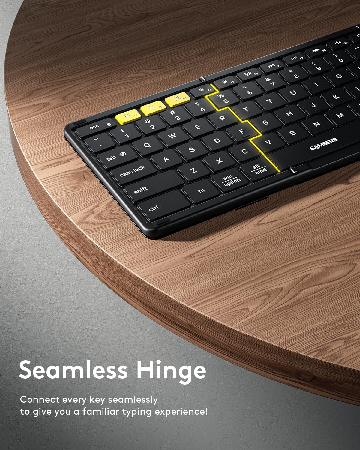 - 【Full-size Folding Wireless Keyboard】 Elevate your workspace with Samsers foldable keyboard. Designed with standard size (unfolded size: 13.5 x 4.5 inch) and 0.63 inch standard keys, more in line with finger size and typing habits. Innovative seamless metal hinge, allow you to adapt to its layout anytime and anywhere. Quiet scissor-switch keys and non-slip PU leather at the bottom, so that you can fully concentrate on your work!