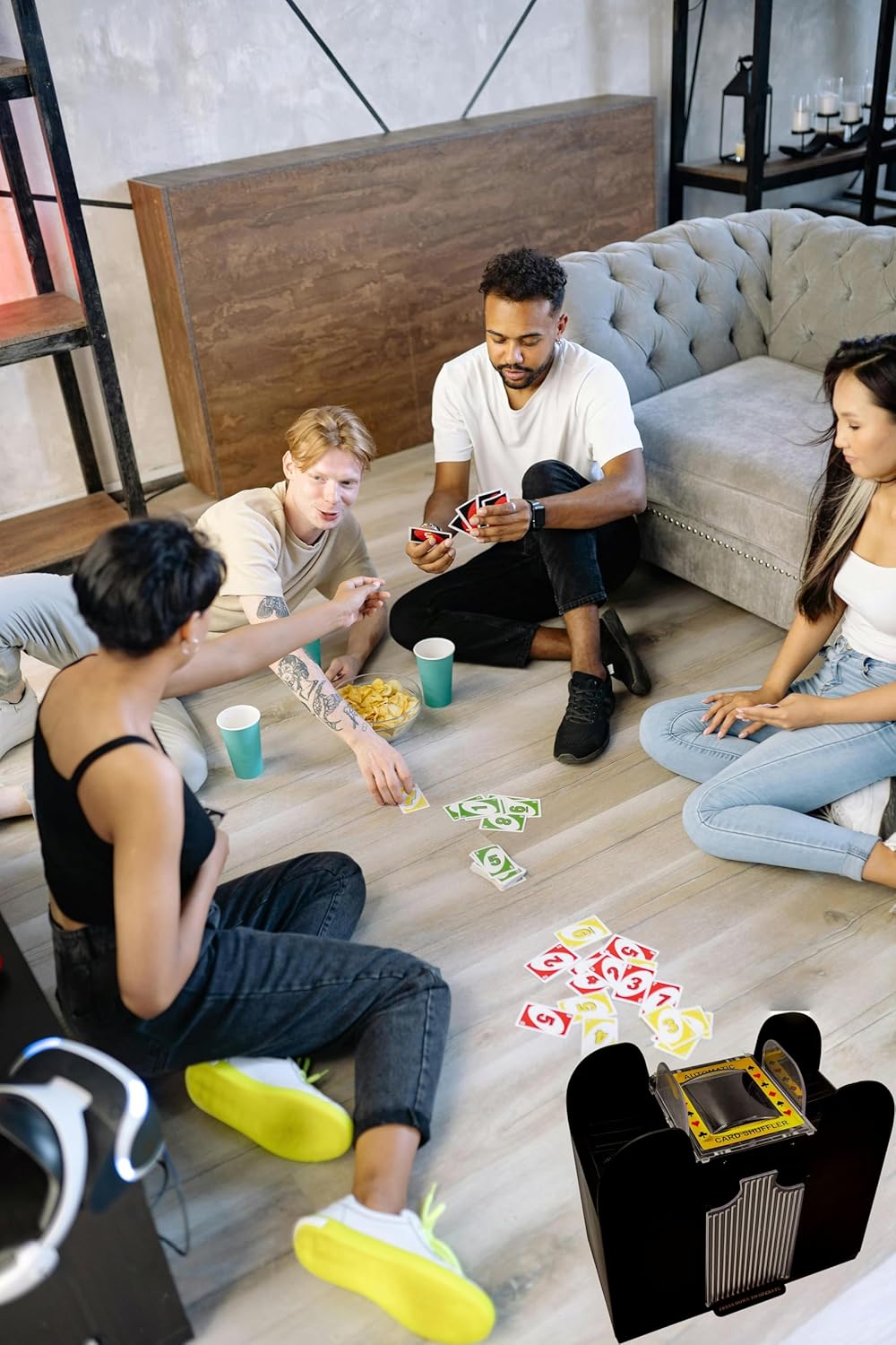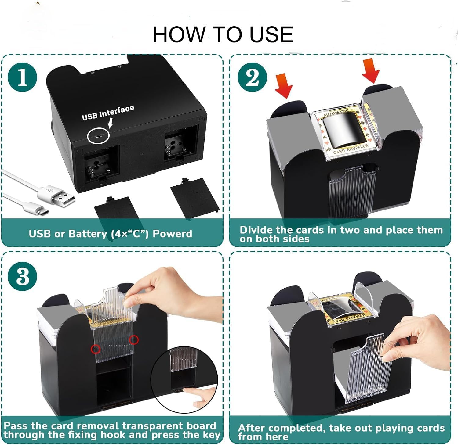 - "Game Night MVP! 🏆 Our automatic card shuffler delivers lightning-fast shuffling (2 sec/deck!) with zero card jams —perfect for Poker, Blackjack, and family game nights. Say goodbye to sore hands!