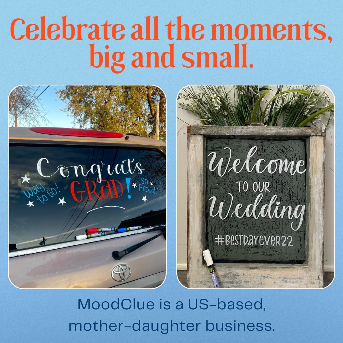 - ⭐️ GREAT FOR AUTO WINDSHIELDS + CAR WINDOWS - Decorate your car glass, windshields and mirrors. MoodClue liquid chalk marker pens are perfect for car decorating for graduation, weddings, birthdays. Auto dealerships love them too!