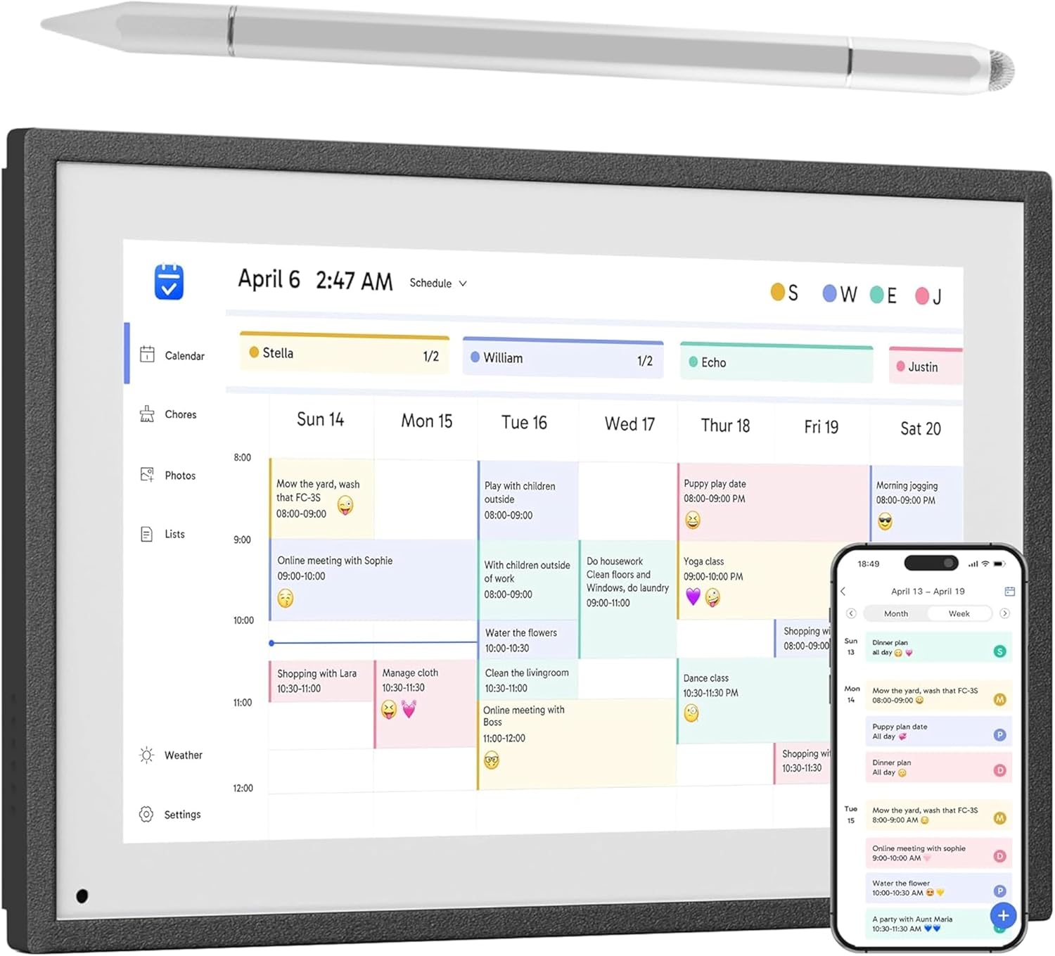 - 【Universal Compatibility】Stylus pen Compatible With Skylight 15" Calendar.10.1-Inch,15.6-Inch,27-Inch Smart Digital Calendar,all smart electronic touch calendars.Use a stylus to easily create, edit, and manage activities for a digital electronic calendar. Add detailed information, set reminders, and even schedule regular events to simplify your planning process. iPad stylus tablet pen Compatible with capacitive touch screen devices( Apple iPhone/iPad, Samsung Galax, Android, Microsoft, Laptop, Kindle,HP,Dell, Surface etc), perfect for writing,drawing apps, taking notes, playing games. This would be a great gift for kids, students, artists, gamers and professionals.