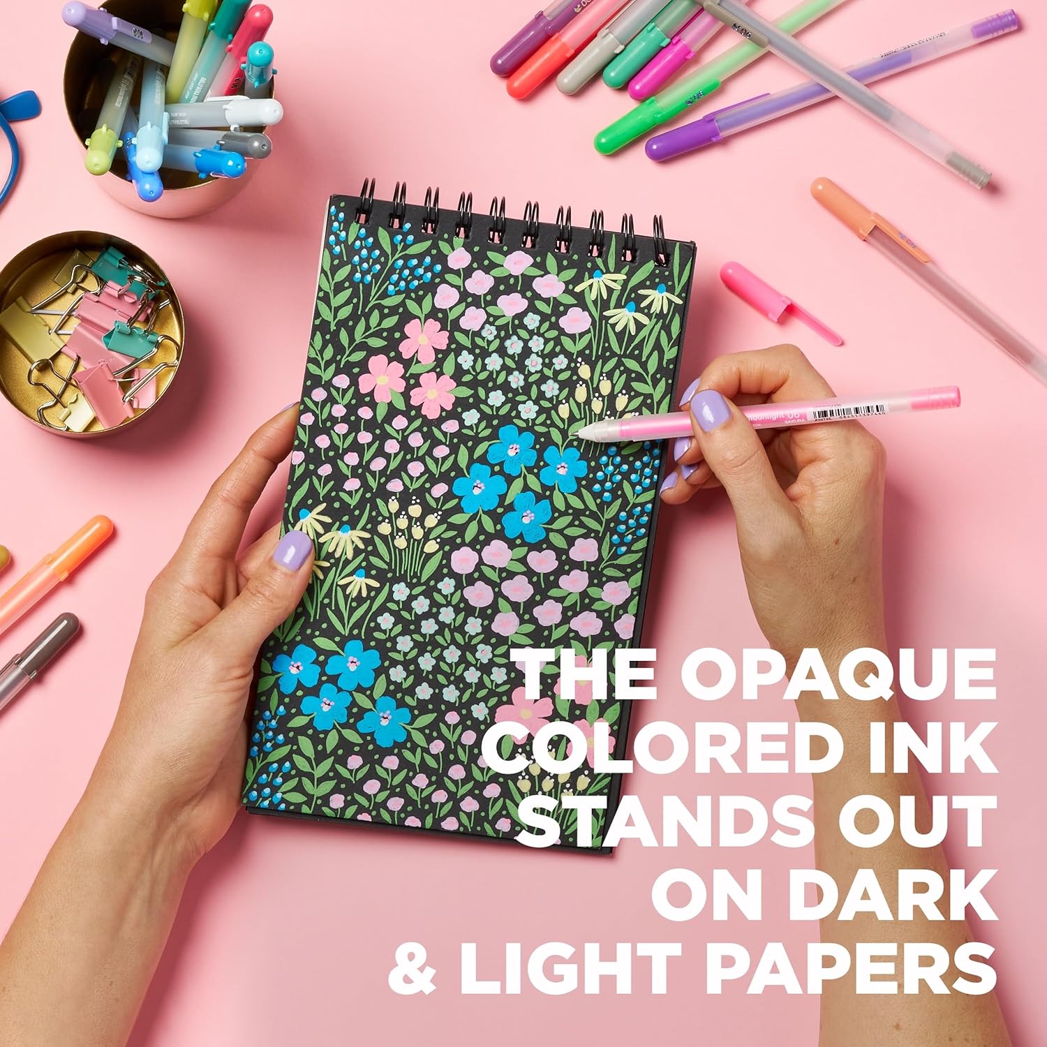 - Bright, Opaque Colored Ink: Gel pens have paint-like colored ink that flows creamy smooth onto light and dark paper