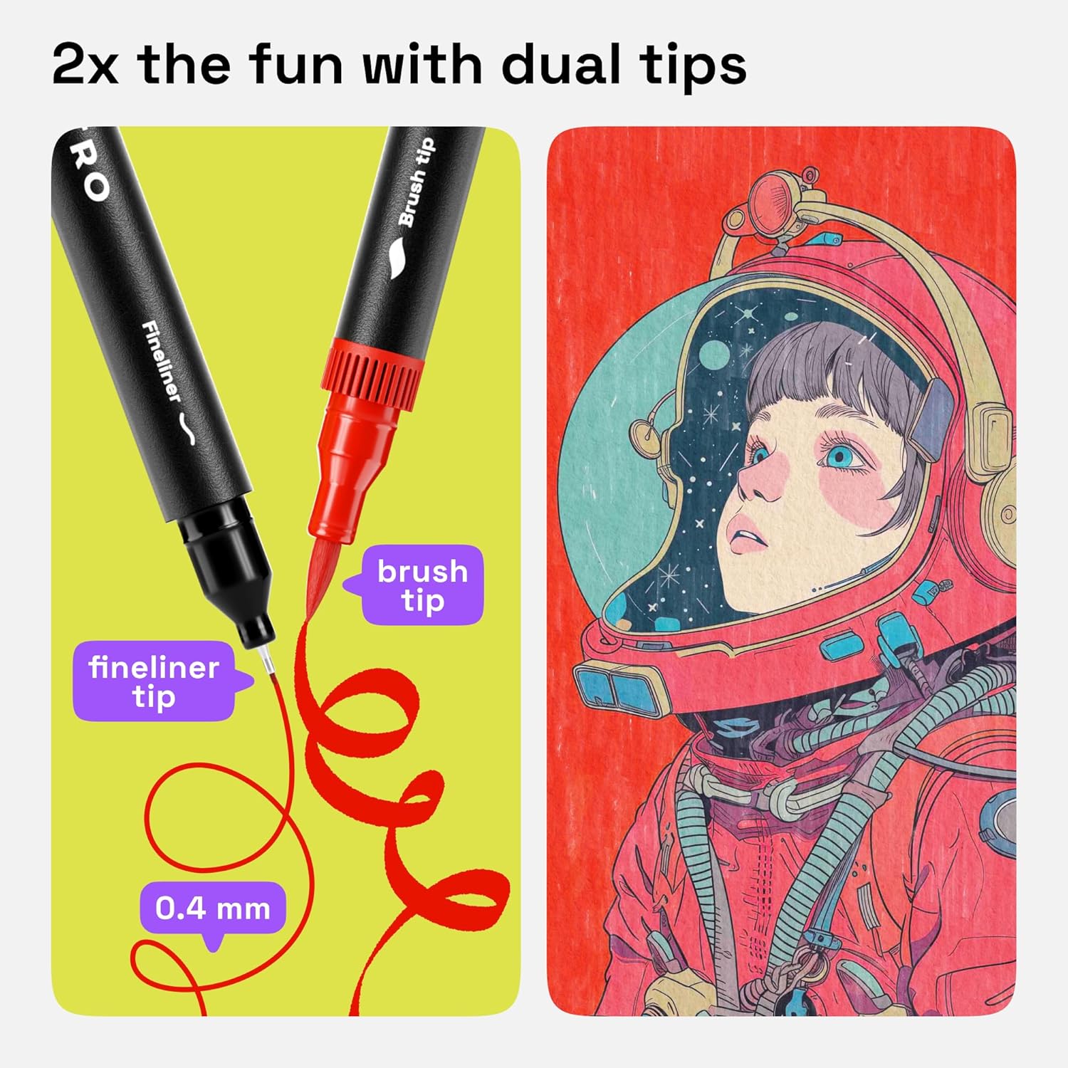 - BRUSH & FINE POINT PENS: Explore endless opportunities with these dual-ended drawing pens. You get 2-in-1 art pens that are both 0.4 mm fine tip pens and dual brush marker pens. These coloring markers are perfect for doodling, coloring, writing, and coloring books.
