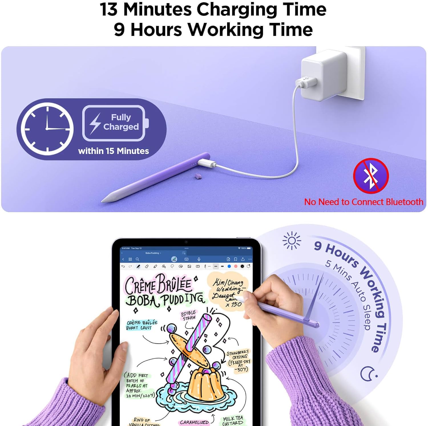 - 【15 Mins Fast Charging, 9 Hours of Use】 No need to charge frequently. Experience uninterrupted creativity with our iPad pencil lightning-fast charging capabilities. 2X Faster Charging speed than others. Just 15 minutes of charging provides an impressive 9 hours of continuous usage, long lasting battery life.This ensures that your creative process is not interrupted. You can use it all day long.