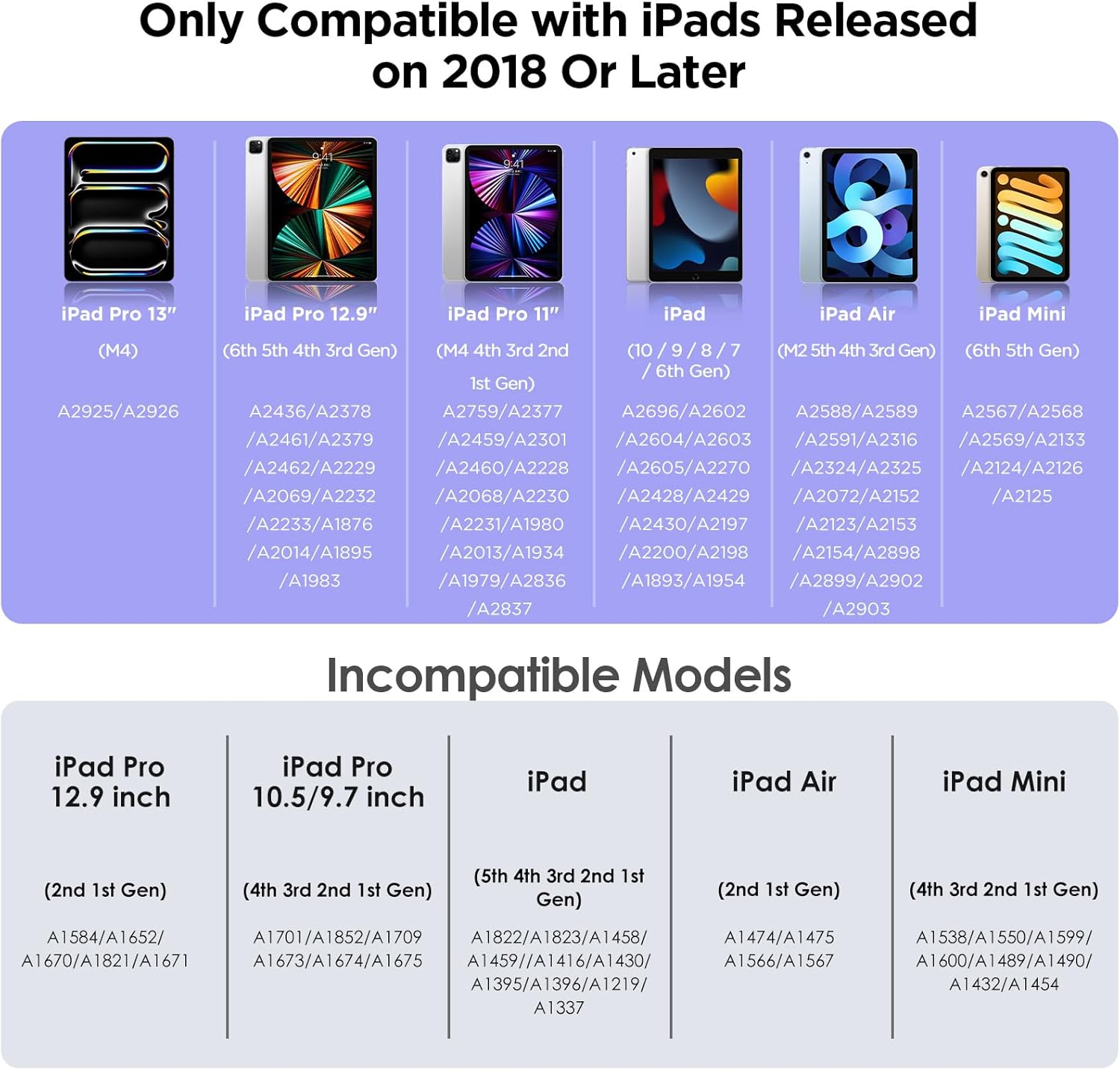 - Compatible Devices : iPad Air Series: iPad Air (2024, M2) ; iPad Air 5th - A2588/A2589/A2591; iPad Air 4th -A2316/A2324/A2325/A2072; iPad Air 3rd - A2152/A2123/A2153/A2154, iPad Pro Series: iPad Pro 11-inch (2024, M4); iPad Pro 13-inch (2024, M4); iPad Pro 11-inch (2018-2023) - A2759/A2435/A2761/A2762/ A2377/A2301/A2459/A2460 /A2228/A2068/A2230/A2231/A1980/A2013/A1934/A1979; iPad Pro 12.9-inch (2018-2023) - A2436/A2764/A2437/A2766/A2378/A2379/A2461/A2462/ A2229/A2069/A2232/A2233/A1983/A2014/A1895/A1876, iPad Series: iPad 10th (2022) - A2696/A2757/A2777; iPad 9th (2021) - A2602/A2603/A2604/A2605; iPad 8th (2020) - A2270/A2428/A2429/A2430; iPad 7th (2019) - A2197/A2200/A2198; iPad 6th (2018) - A1893/A1954;, iPad mini Series: iPad mini 6th -A2567/A2568/A2569; iPad mini 5th - A2133/A2124/A2126/A2125 iPad Air Series: iPad Air (2024, M2) ; iPad Air 5th - A2588/A2589/A2591; iPad Air 4th -A2316/A2324/A2325/A2072; iPad Air 3rd - A2152/A2123/A2153/A2154, iPad Pro Series: iPad Pro 11-inch (2024, M4); iP… See more